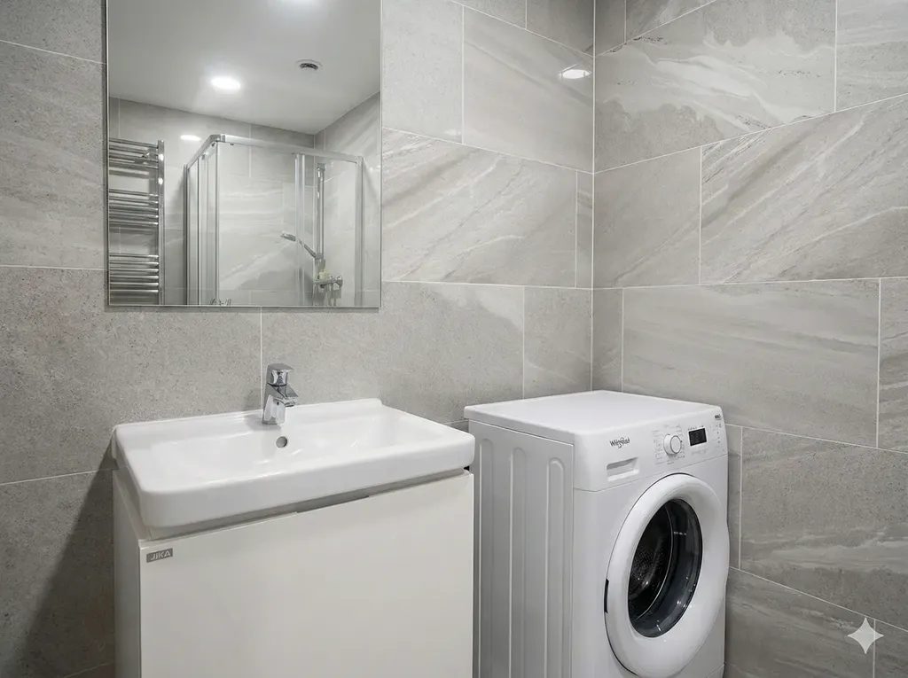 ​Koupelny s WC: Koupelna v nadčasovém béžovém dekoru disponuje sprchovým koutem, umyvadlem se skříňkou, topným žebříkem a prostorem pro pračku.