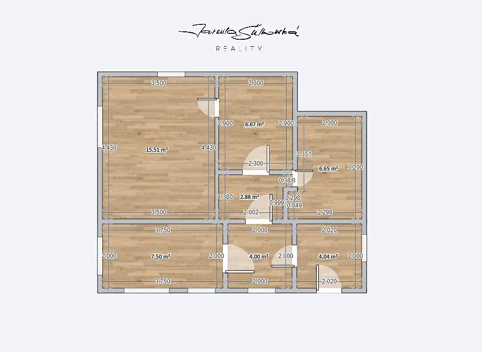 přízemí: zádveří, kuchyni, obývací pokoj, menší průchozí pracovnu nebo jídelnu s krbovými kamny a koupelnu, podkroví: ložnici a šatnu
