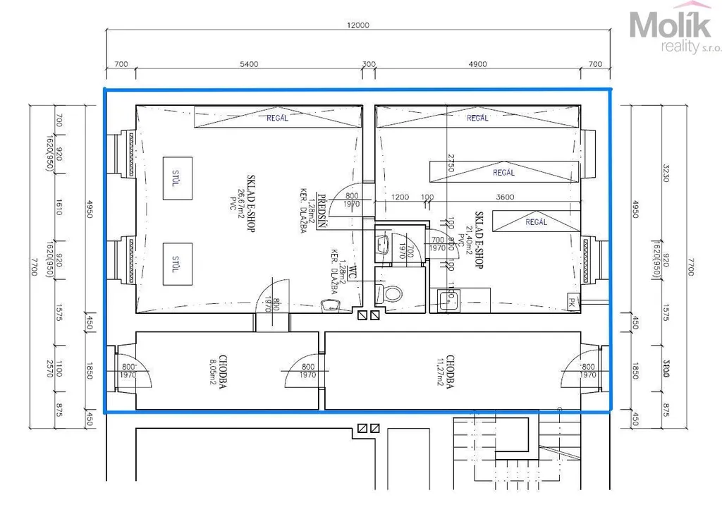 Dispozice: Hlavní prostor (26,67 m2), vedlejší prostor s kuchyňským koutem (21,40 m2), sociální zařízení s WC (2,5 m2), společná chodba v přízemí domu.