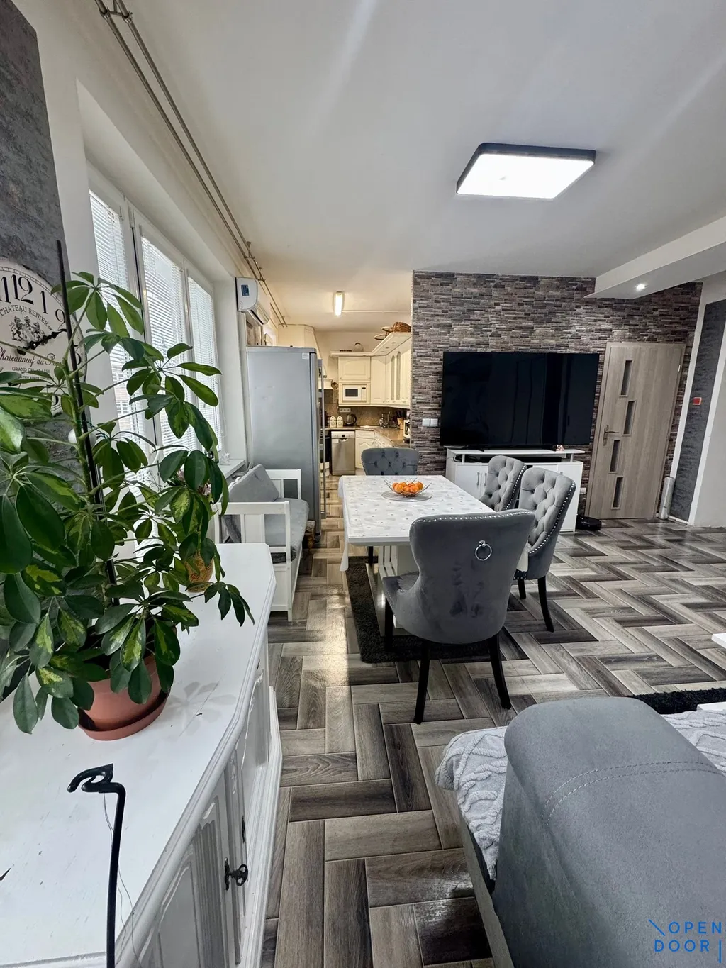 Kuchyně je vybavena kuchyňskou linkou do tvaru U s vestavnými spotřebiči – horkovzdušná trouba, varná deska Gorenje, mikrovlnná trouba, myčka nádobí a digestoř. V bytě je dále instalována klimatizace značky Samsung, která zajišťuje komfort i v letních měsících.