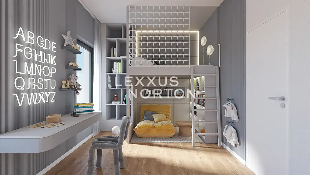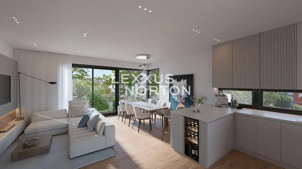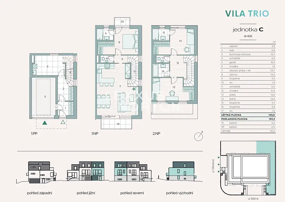 Nový komorní projekt Vila Trio Strašnice představuje zcela výjimečné městské domy řadového typu, jejichž architektura i dispoziční řešení nesou prvky anglického townhouse stylu. Nejedná se o běžný projekt – každý dům je originál, který si získá i nejnáročnější klienty hledající osobité, nadstandardní a reprezentativní bydlení pro svou rodinu. Nabízíme mimořádně prostorný rodinný dům 4+kk s celkovou podlahovou plochou 153,2 m², soukromou zahradou a garáží pro jeden automobil. Koncept domu byl navržen tak, aby splňoval vysoké nároky moderního městského života a zároveň poskytoval klid a komfort rodinného bydlení. Dispozice domu se skládá ze tří pater – přízemí, hlavní obytné patro a horní patro. V přízemí naleznete vstupní halu, technickou místnost a garáž. Hlavní obytné patro nabízí velkorysý obývací prostor s kuchyňským koutem (33,7 m²) a přímým vstupem na dva balkony, které přirozeně rozšiřují obytnou část domu. Dále zde najdete samostatnou toaletu a hlavní ložnici s vlastní koupelnou a šatnou (14,6 m²). Horní patro se skládá ze dvou světlých místností, z nichž jedna má vlastní koupelnu. Vhodné budou jako dětské pokoje, pracovna či pokoje pro hosty. Naleznete zde i útulnou moderní koupelnu s oddělenou toaletou. Půdorys poskytuje dostatek místa a soukromí nejen k trávení společného času, ale zároveň i k odpočinku.