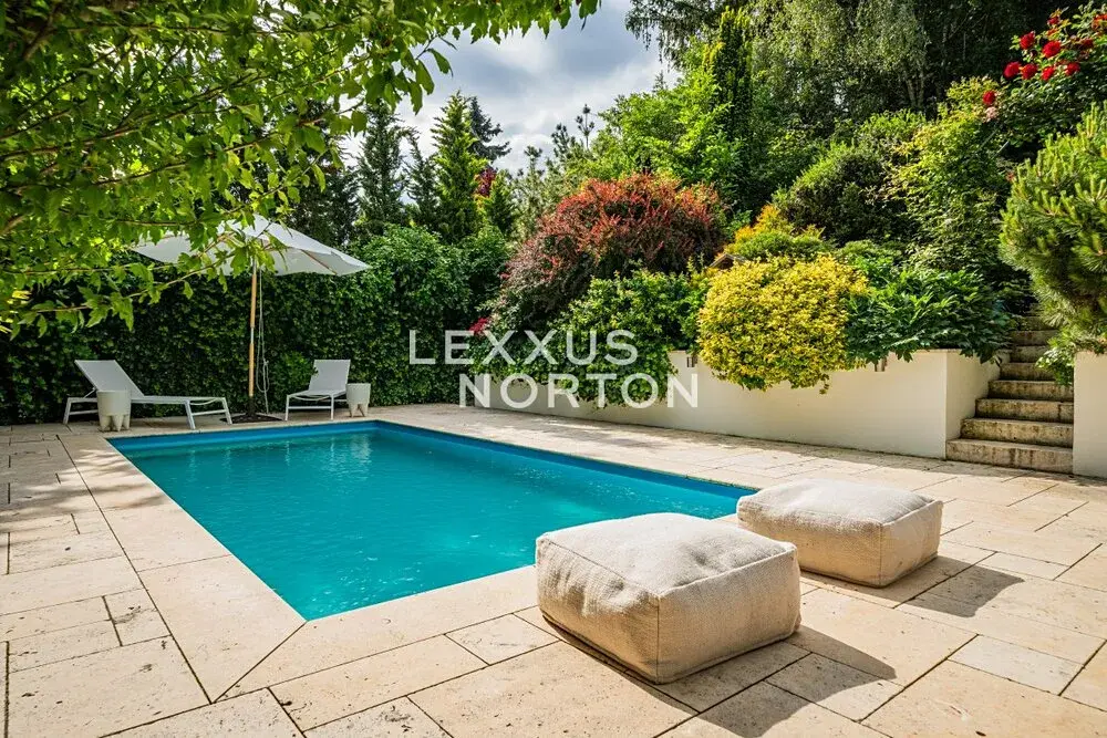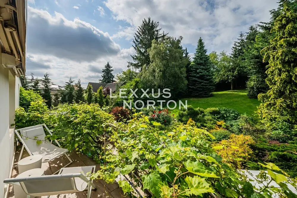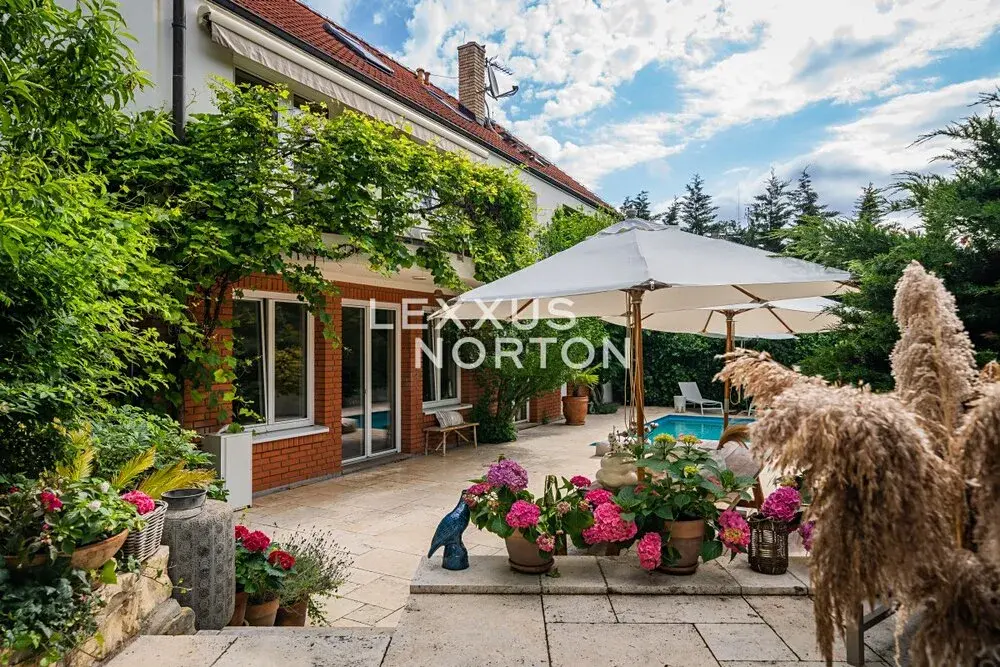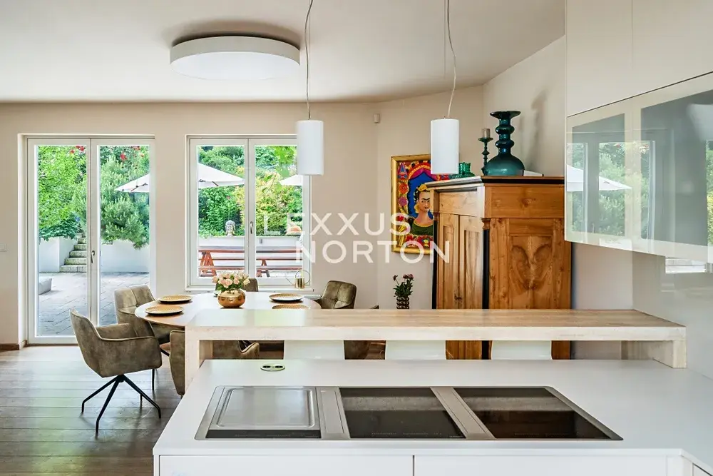Při rekonstrukci byl kladen důraz na přírodní materiály a propojení interiéru s exteriérem. Travertin, masivní dřevo, vzrostlé stromy, okrasné keře, exotické palmy — vše tvoří harmonickou zahradní oázu, která nabízí klid a soukromí po celý rok. Na pozemku je také prostorný zahradní dům s vytápěním a elektřinou.