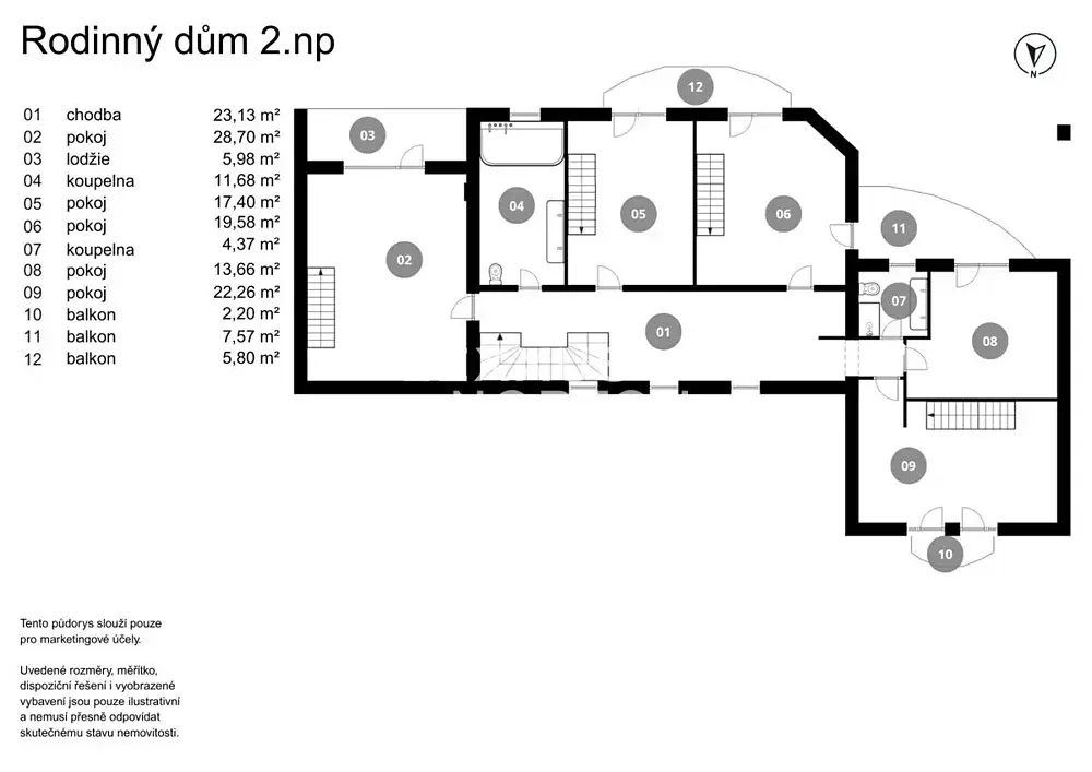Vila o celkové ploše 522 m² disponuje mimořádně funkční dispozicí. Součástí je pět samostatných ložnic a zcela nezávislý byt 1+kk se soukromým vstupem — ideální pro hosty, rozšířenou rodinu či jako zázemí pro vlastní personál.