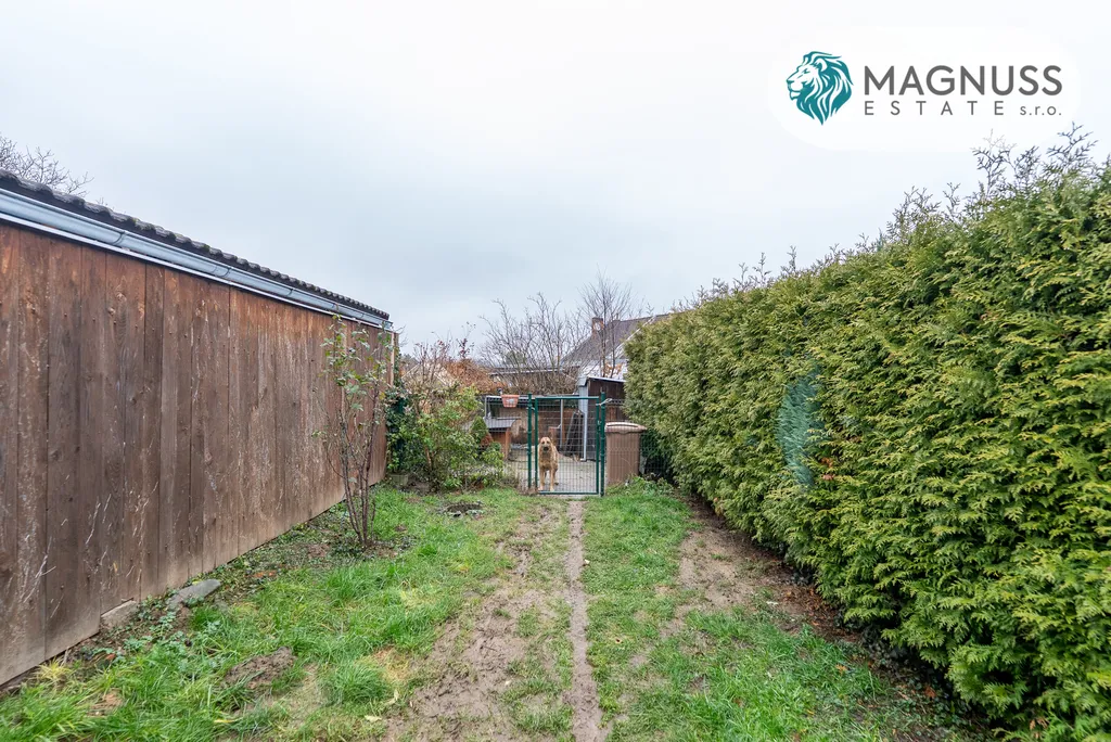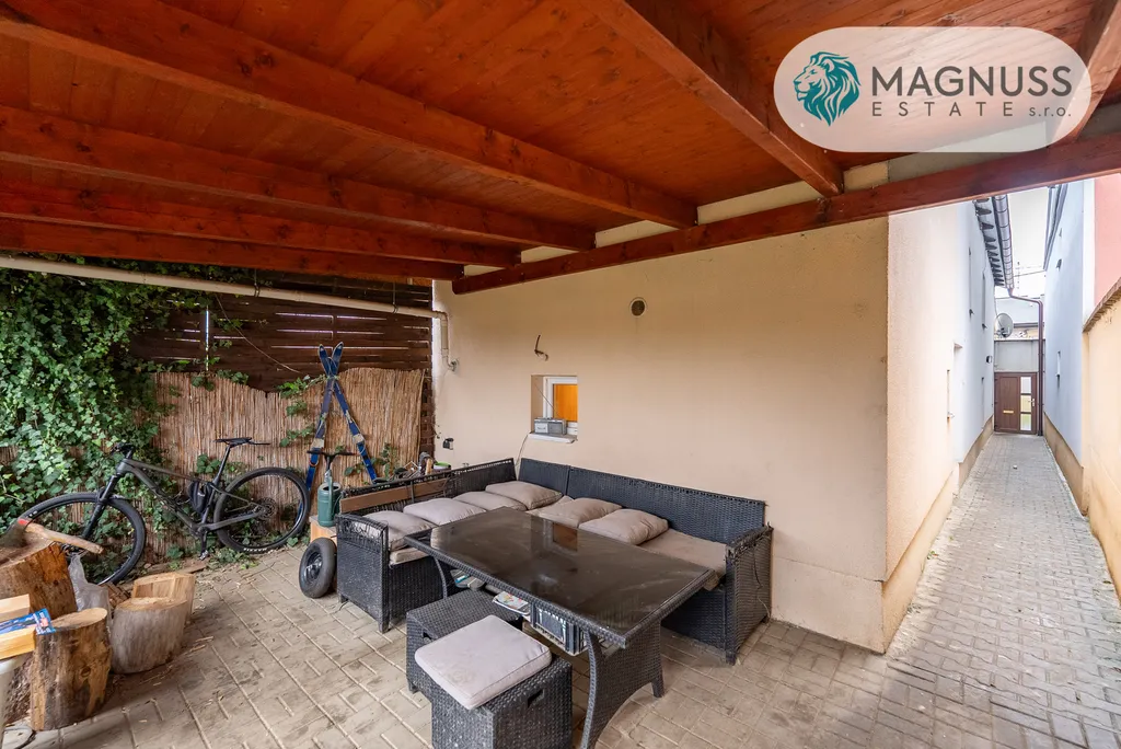 Za domem se nachází zastřešená pergola s posezením, ideální pro relaxaci a rodinné chvíle. Součástí užívání je také zahrada za domem, která je pronajata od města za symbolickou cenu.