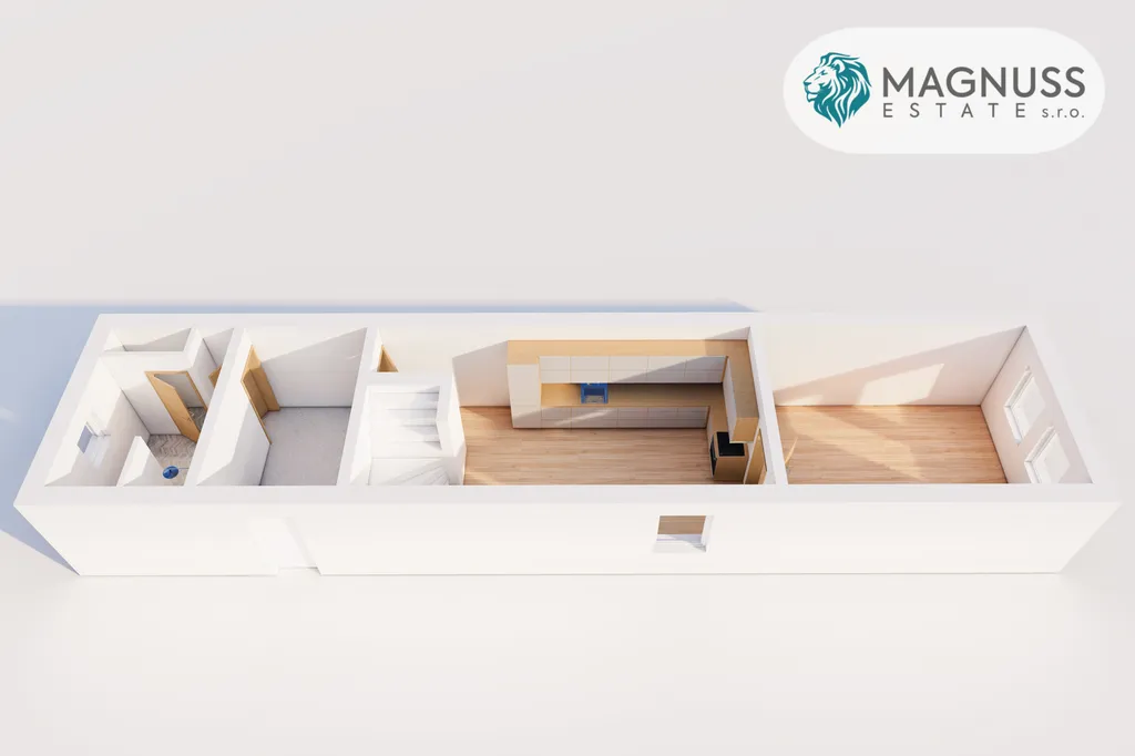 • 1. NP: vstupní chodba, koupelna se sprchovým koutem a WC, kuchyně a ložnice