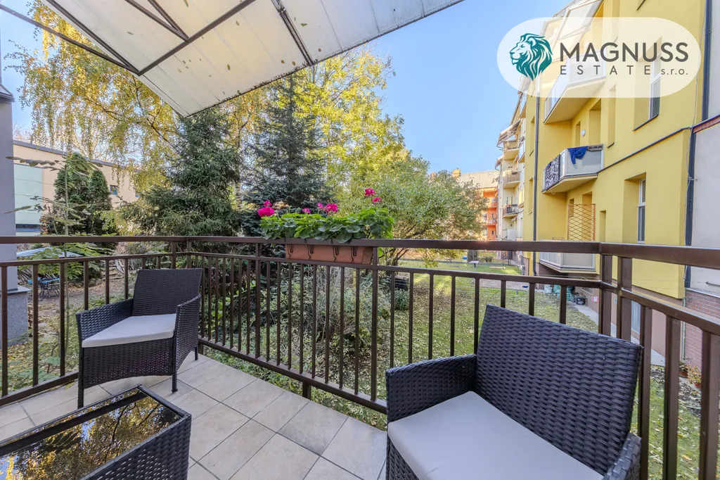 K bytu náleží prostorný balkon orientovaný do klidného dvora s výhledem do zeleně, jenž zaručuje maximální soukromí. Obyvatelé mohou také využívat zahradu ve vnitrobloku za domem. Parkování je bezproblémové – přímo před domem v neplacené zóně.