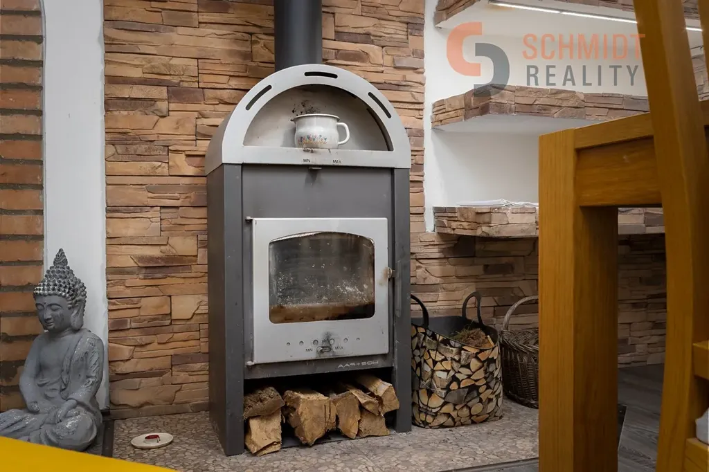 - Vytápění domu zajišťuje elektrický kotel napojený na radiátory, doplněný o krbová kamna,