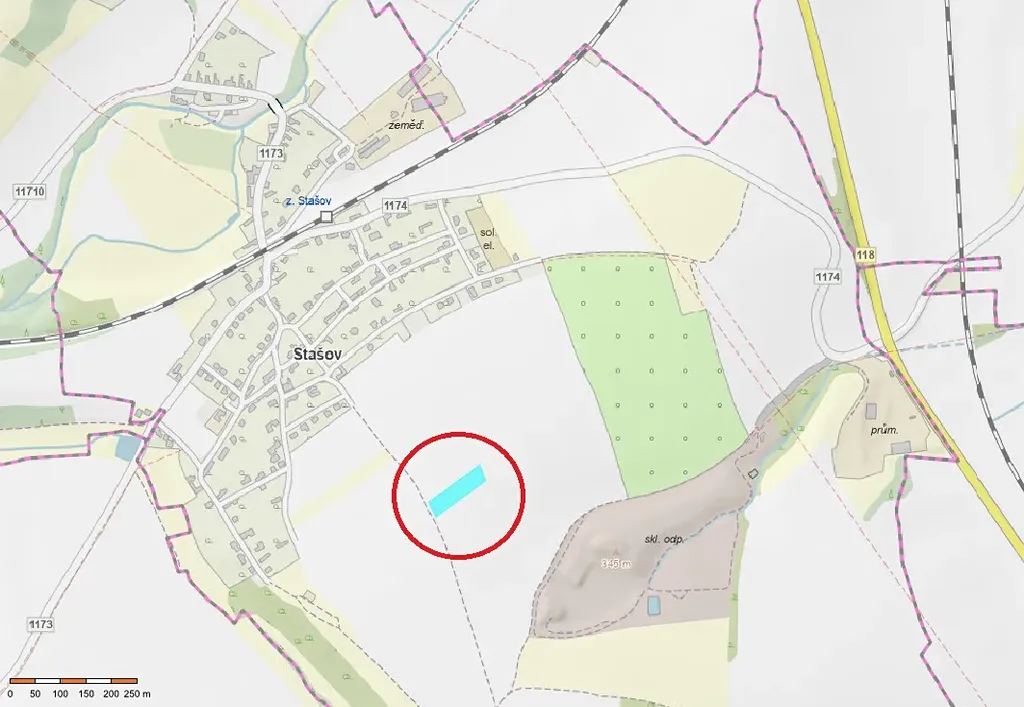 Pozemek se nachází na jižním okraji obce, v lokalitě Nade vsí, přímo u obecní komunikace ve vlastnictví obce Stašov, což zajišťuje bezproblémový a trvalý přístup.