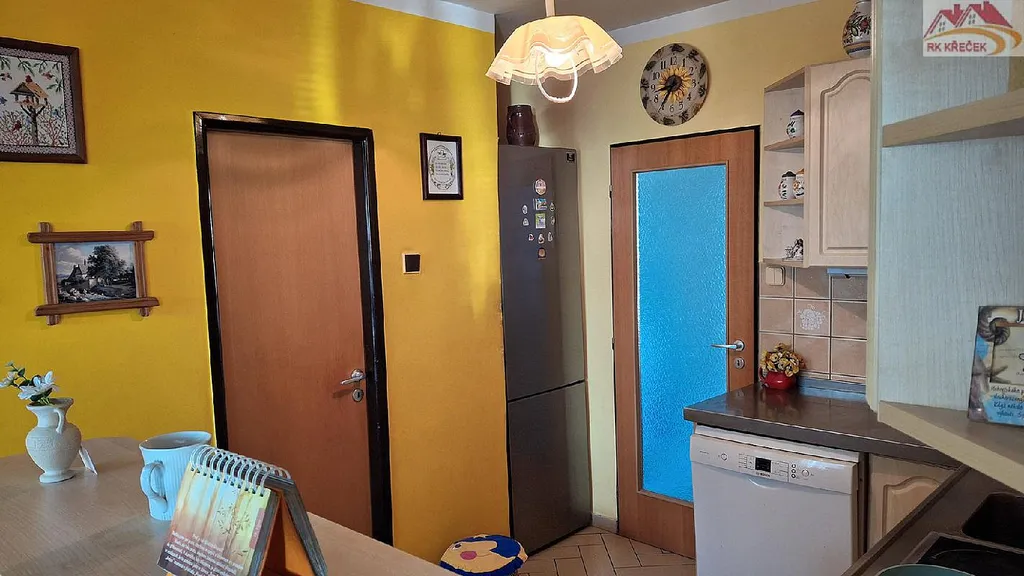 Dům má dispozici 5+kk + pokoj v suterénu. V suterénu domu se tedy nachází garáž, již zmíněný pokoj pro přespání hostů, šatna a špajska, prádelna, koupelna se sprchovým koutem, umyvadlem a WC dohromady, vodárna, která je připojená jak na obecní vodu, tak na studnu. Vytápění domu je novým kondenzačním kotlem. Je zde i vchod do sklepa, který je vhodný i pro vinaře. V přízemí domu se nachází předsíň, velká hala, koupelna s rohovou vanou, 2x umyvadlem a sprchou, samostatné WC, schodištěm do prvního patra a obývací pokoj s kuchyňským koutem se spotřebiči, špajskou, jídelna s oválným stolem, židle, rustikální nábytek, vše z kvalitního dřevěného masívu, obývací pokoj s novou velkou LCD televizí, sedací souprava. Z haly vedou dřevěné schody do 1. patra, kde jsou tři pokoje, z toho jeden pokoj je průchozí, vstupy na balkony (dům má 2 prostorné balkonu), WC. Dům má tepelnou izolaci v omítce s přísadou koloidního stříbra.