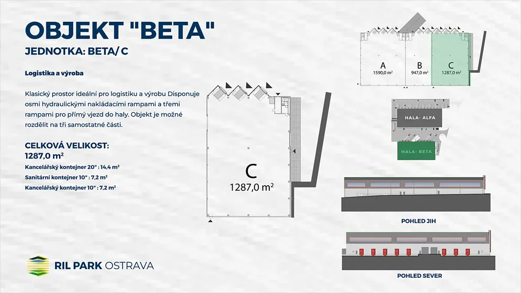 Představujeme vám RIL Park Ostrava, moderní business park o rozloze přes 30 ha, který zahrnuje dvě samostatné budovy, Alfa a Beta, navržené pro maximální efektivitu a komfort vašeho podnikání. Každá budova disponuje samostatným vjezdem a nabízí flexibilní prostory pro skladování, výrobu i administrativu.