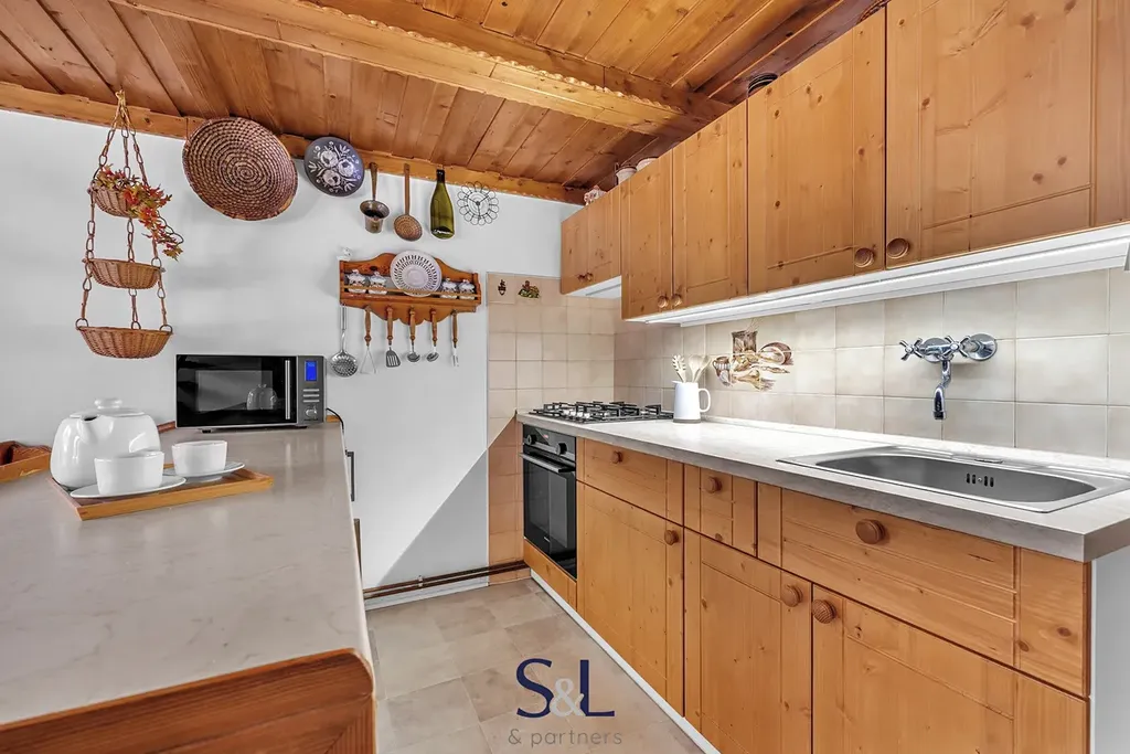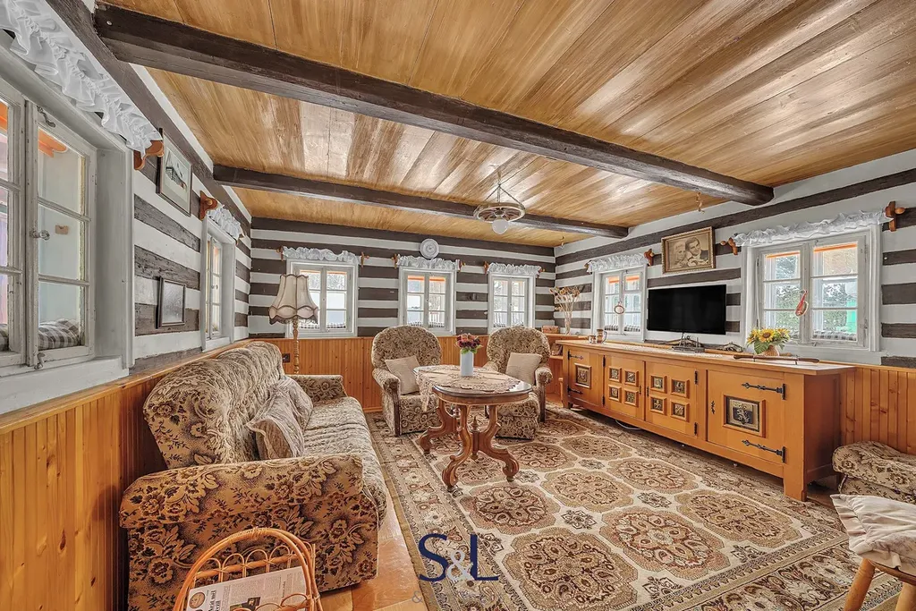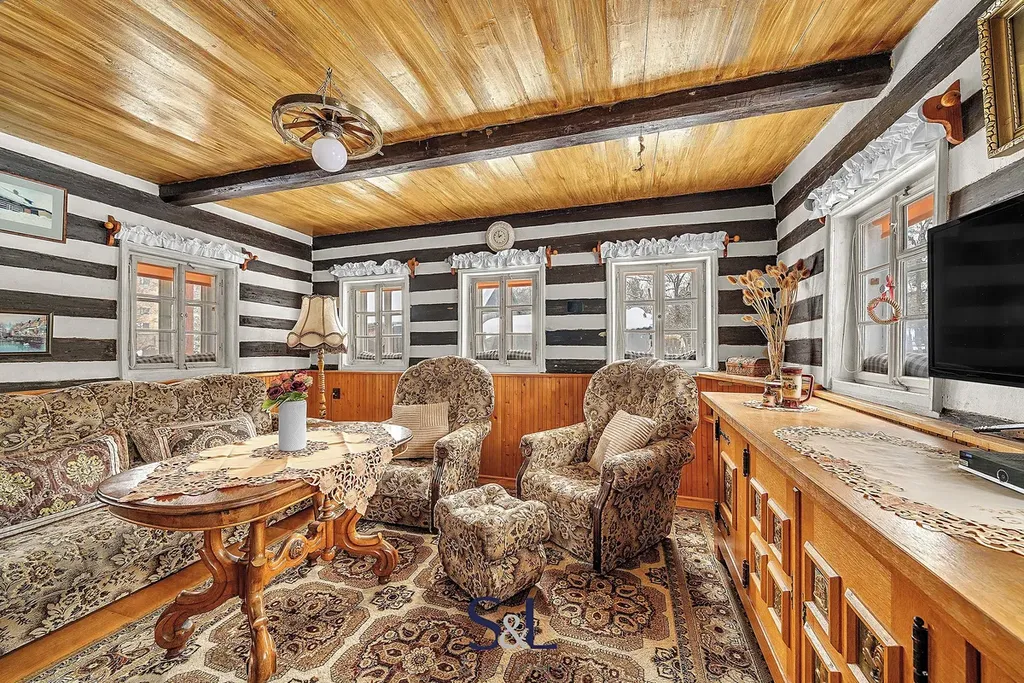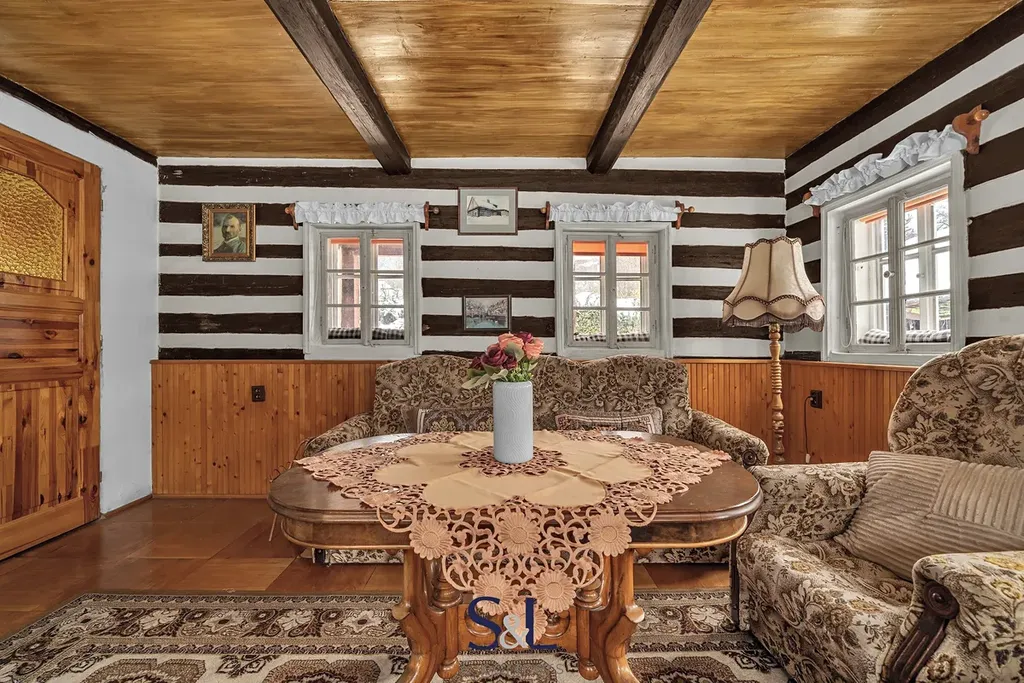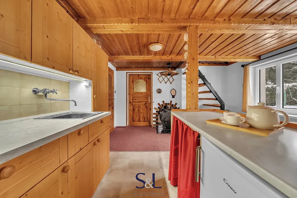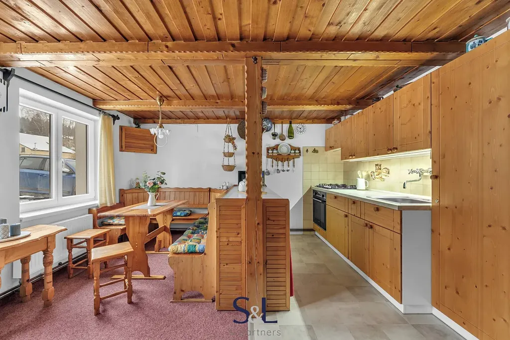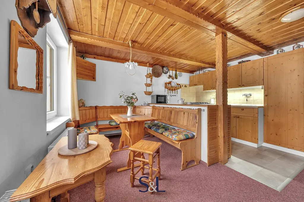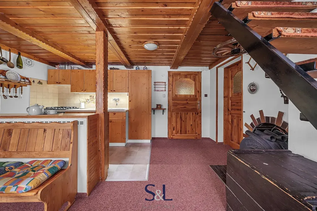 Interiér si zachoval autentický horský charakter – obývací pokoj s roubenými prvky a kamny na dřevo, kuchyni s jídelním koutem, koupelnu s vanou a WC a dvě podkrovní ložnice v patře.