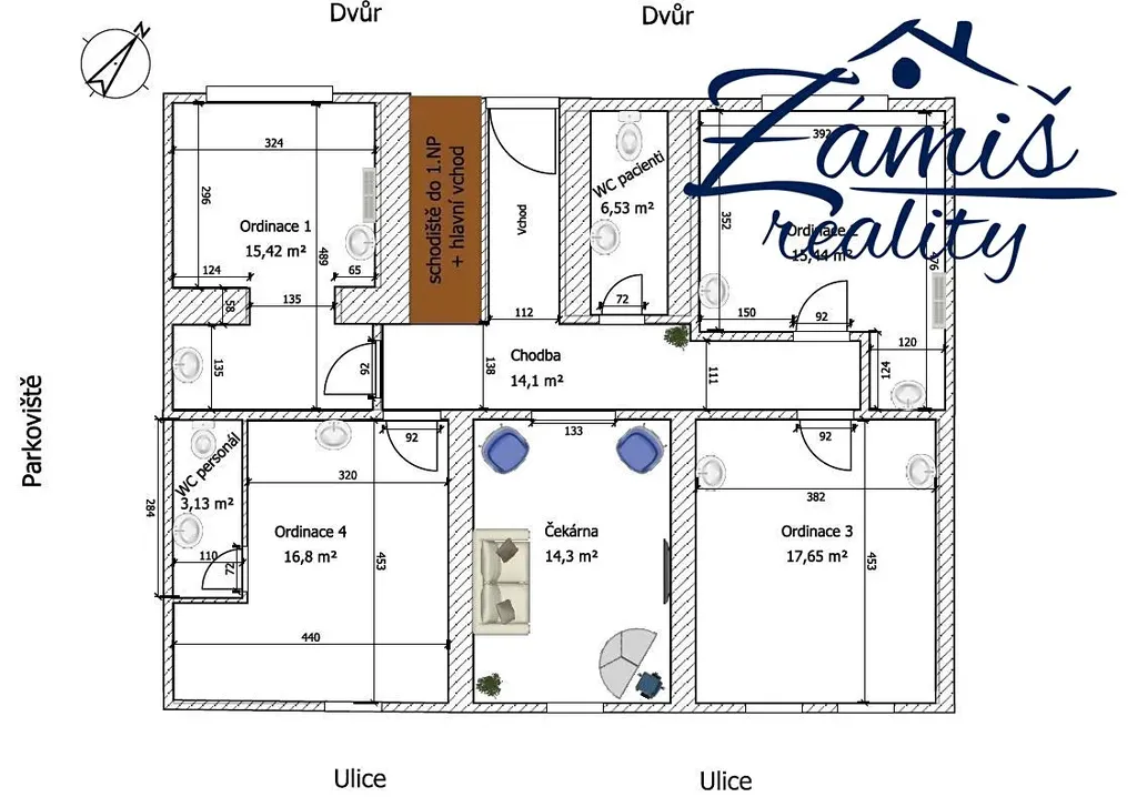 V nákresu půdorysu je volná místnost označena jako and #34;Ordinace 3 and #34;.
