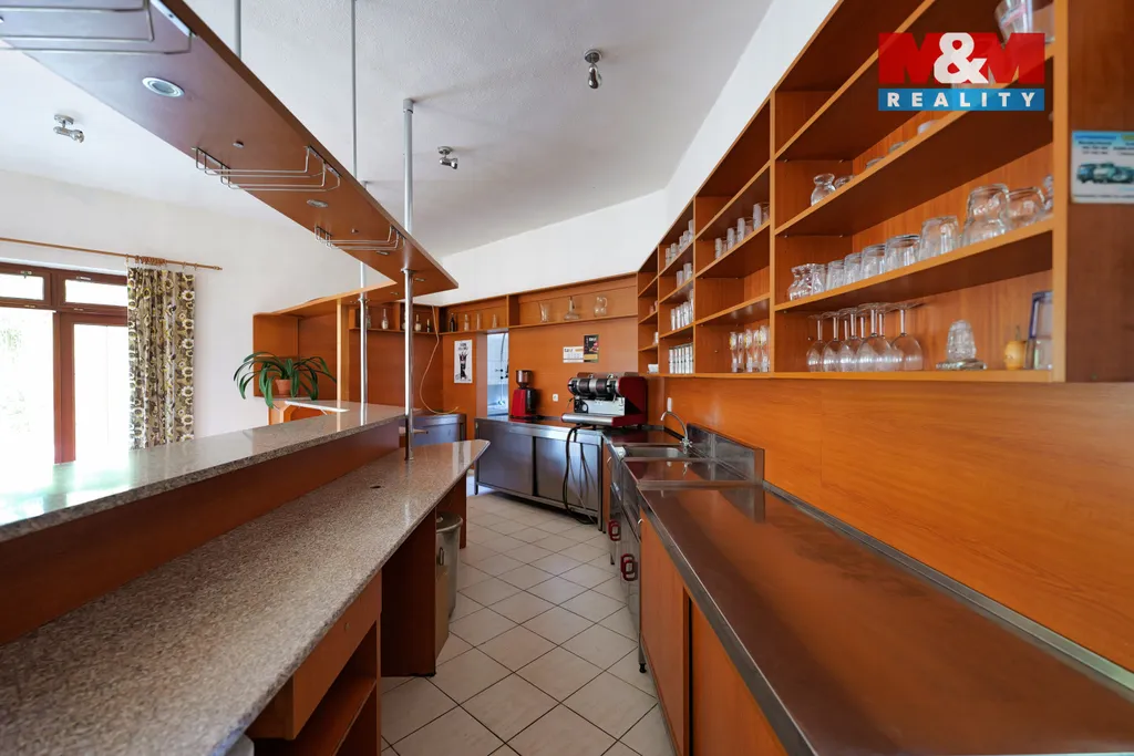 1. nadzemní podlaží – komerční část (12 místností): větší sál s kapacitou 25–35 osob, bar a kompletně vybavená nerezová kuchyně, ideální pro hospůdku, svatby či oslavy a přímý vstup na dvorek. Druhý sál pro 35–40 osob s menším barem, dále několik úložných prostor, sociální zázemí (WC, sprcha, umyvadla).
