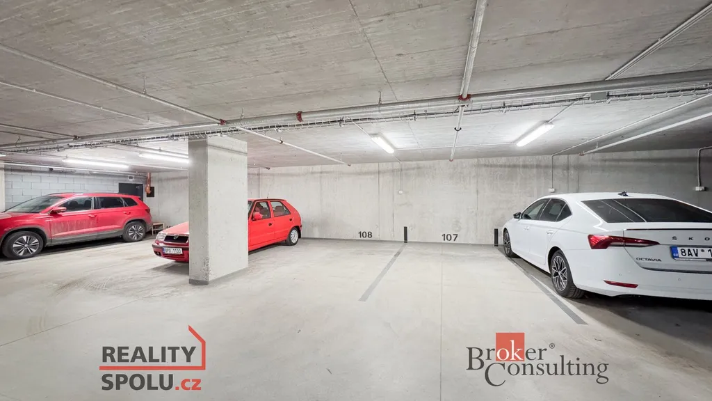 K bytu náleží dvě garážová stání a sklep, které zajišťují pohodlné parkování a dostatek úložného prostoru.