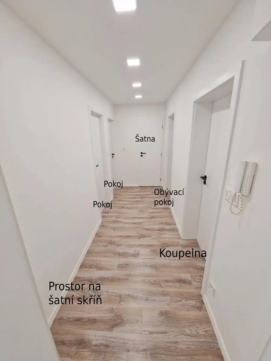 V kuchyni je prostorná rohová linka v bílém lesku s vestavnými kamny a indukční deskou. Koupelna je laděna do moderního stylu, je zde sprchový kout i vana, WC je součástí koupelny. V šatně je k dispozici šatní skříň. V bytě jsou položeny vkusné podlahy, ve všech místnostech jsou bílé interiérové dveře s obložkami. Vše je dotaženo do posledního detailu. Místnosti jsou prostorné. K bytu náleží sklep.