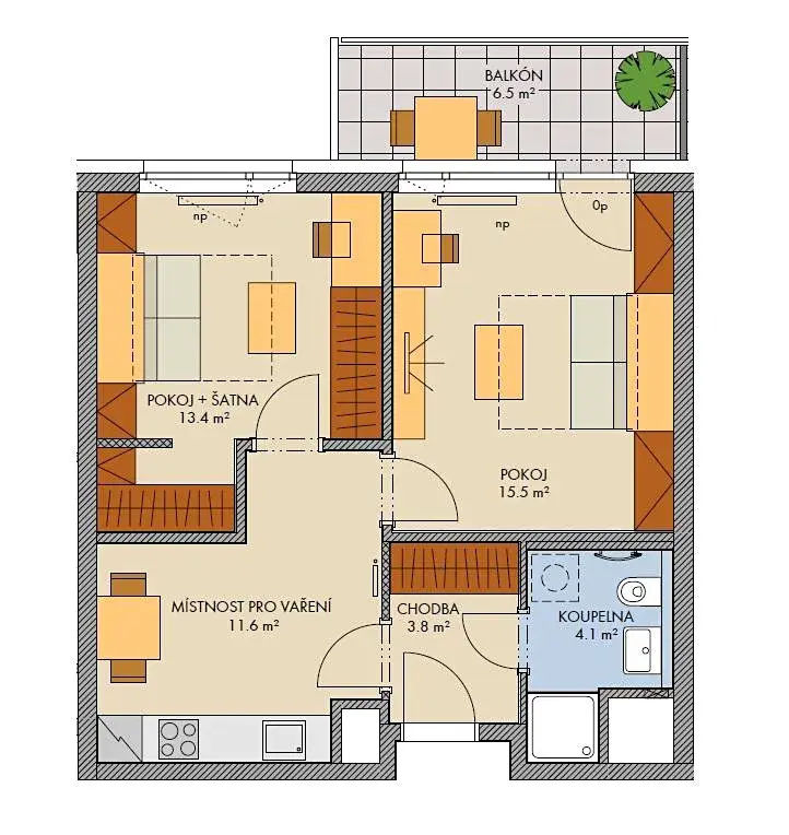 Bytová jednotka 2+1 o velikosti 51,0 m2 + balkón 6,5 m2 se nachází ve 4. nadzemním podlaží (z celkových šesti) s orientací na severozápad.