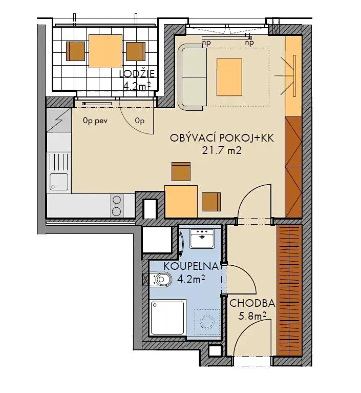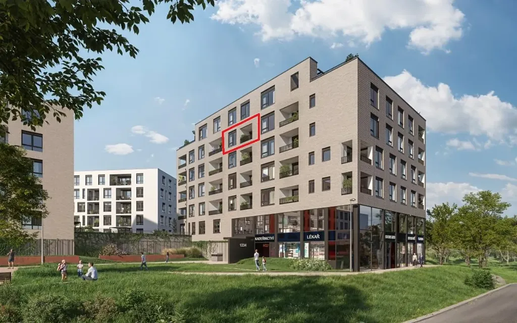 Byt 1+kk o velikosti 32,5 m2 + lodžie 4,2 m2 se nachází v 5. nadzemním podlaží (z celkových šesti) s orientací na jihovýchod.