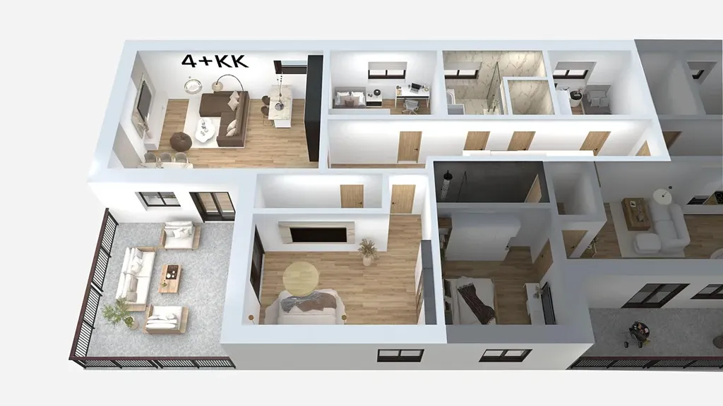 Projekt půjde do výstavby v roce 2026 a bude dokončen a zkolaudován na konci 1. pololetí 2027. V domě budou vybudovány ještě jednotky o dispozici 2+kk (54 m2) a 3+kk (90 m2) (rovněž naleznete v inzerci).