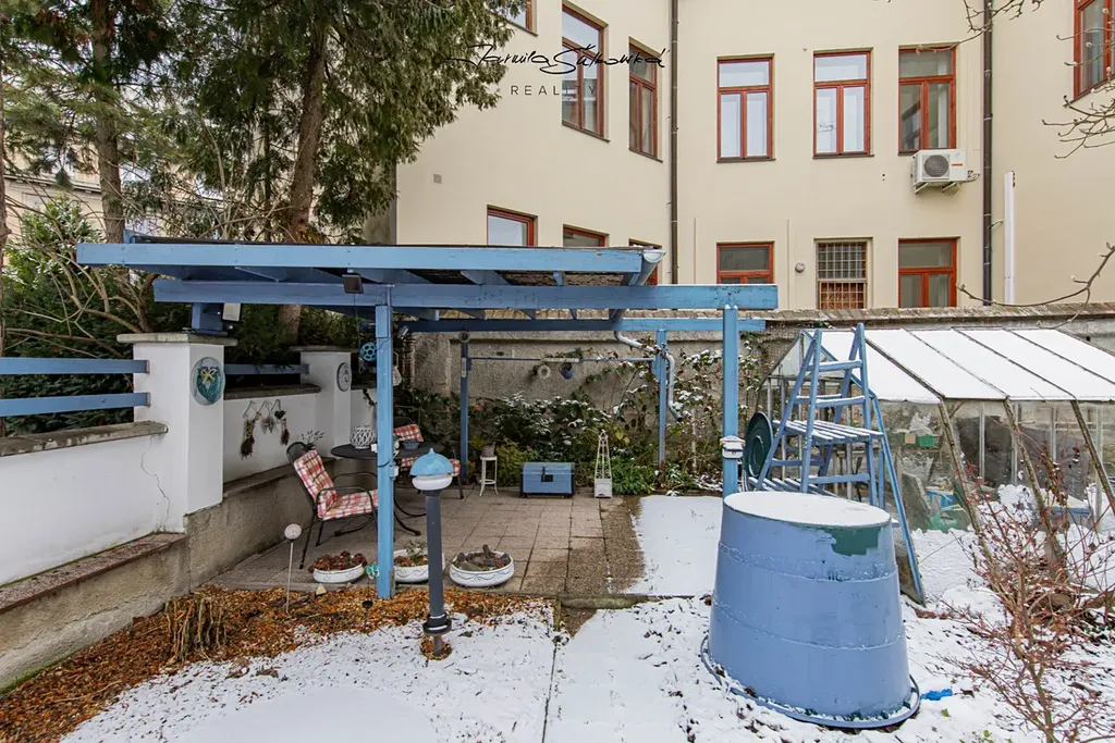 Velkým benefitem je možnost využívat posezení v altánu na zahradě — ideální místo na letní studium, ranní snídani nebo večerní relax pod stromy a kochat se krásnou udržovanou zahradou o kterou majitelé s láskou a invencí pečují. Teď v zimě to není moc vidět, ale od jara do podzimu jste v zeleném ráji. V zahradním přístřešku možnost uschování kol či koloběžek.