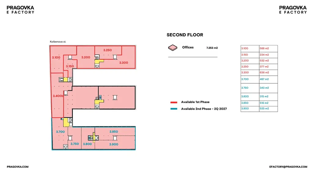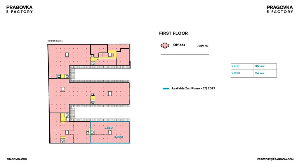 Areál bývalé továrny Pragovka nabízí zrekonstruované kancelářské prostory k pronájmu v historickém industriálním centru městské části Praha 9 – Vysočany. Rozsáhlá budova E Factory je od počátku středobodem celého projektu a dvaadvacetihektarového areálu Pragovky a poskytuje flexibilní kancelářské jednotky o velikostech od 150 až po 4 000 m².