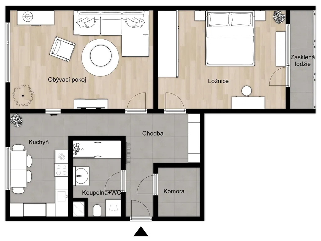 Dispozice se skládá z: prostorného a světlého obývacího pokoje, kuchyně, samostatné ložnice se vstupem na zasklenou lodžii (4,51 m²), koupelny s vanou a WC, komory a prostorné chodby. Celková plocha je 66 m². V suterénu domu najdete sklepní kóji o velikosti 2,20 m² a společnou kolárnu.