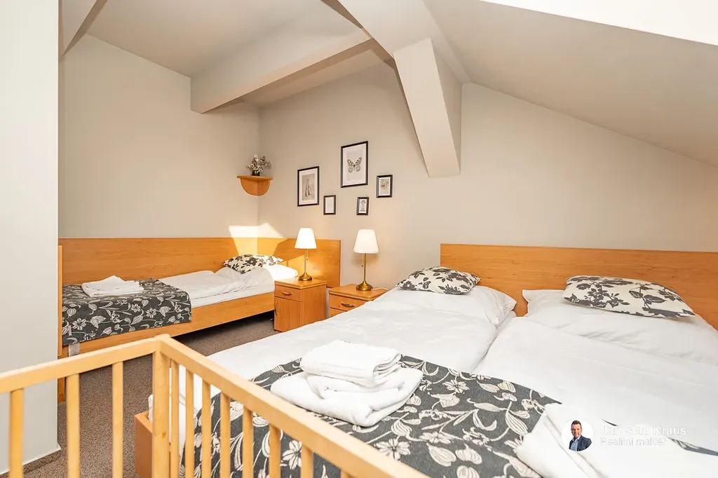Na pozemku o celkové výměře 1 170 m² se nachází zavedený penzion s prosperujícím obchodem a kancelářskými prostory. Tato kombinace z nabídky vytváří mimořádně zajímavou příležitost pro investory hledající funkční a dlouhodobě prověřený způsob podnikání. Nemovitost dosahuje výnosu až 13 % ročně s návratností investice již od 8 let, přičemž provoz je dlouhodobě stabilní a připravený k okamžitému převzetí bez nutnosti dalších zásadních investic.