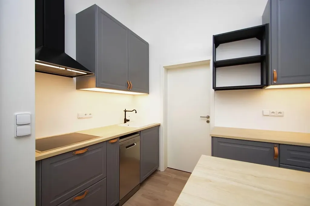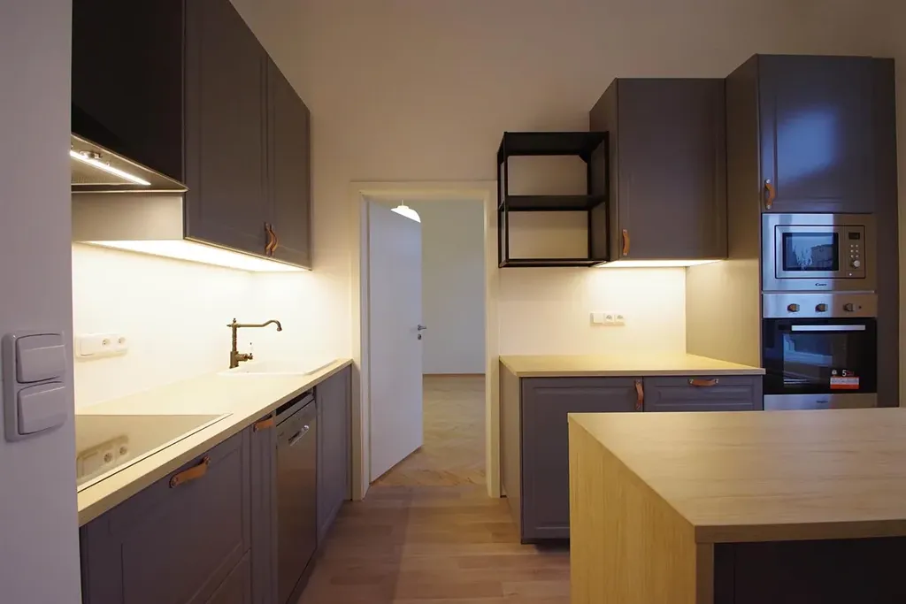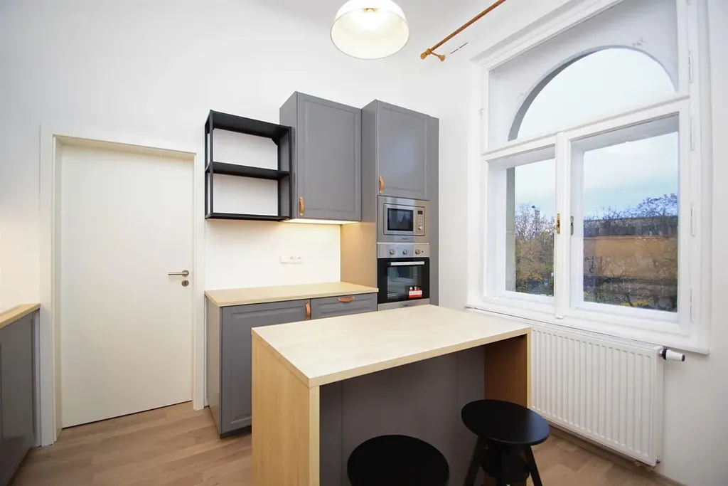 Krásný zrekonstruovaný byt 1+1, s obytnou plochou 42 m2, se nachází ve 4.patře udržovaného secesního domu bez výtahu, v prestižní lokalitě Praha 2 Vinohrady, u parku Riegrovy sady. Interiér bytu je nezařízený a dispozičně nabízí vstupní chodbu s úložným prostorem, velký pokoj (24 m2) s renovovanými původními parketami, kuchyní s vybavenou novou kuchyňskou linkou ve světle šedém odstínu včetně spotřebičů (myčka, elektrická varná deska, ergonomicky umístěná horkovzdušná a mikrovlnná trouba, lednice s mrazákem) a kuchyňským ostrůvkem, dále světlou prostornou ložnici, moderní koupelnu se sprchovým koutem, toaletou a pračkou. Byt je vytápěn plynovým kondenzačním kotlem Bosch (ekonomický provoz).