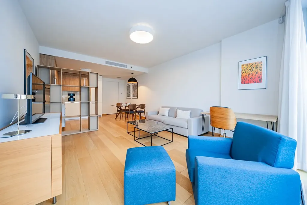 Moderní, plně zařízený byt 2+kk (1 ložnice, 1 koupelna), s terasou (11,48m2) a celkovou plochou 89,58m2, je situován ve 3. NP zcela nového luxusního rezidenčního komplexu s výtahem, recepcí, bazénem, ​​saunou, prostornou zahradou ve dvoře, sklepem a možností parkování v podzemním parkovišti.