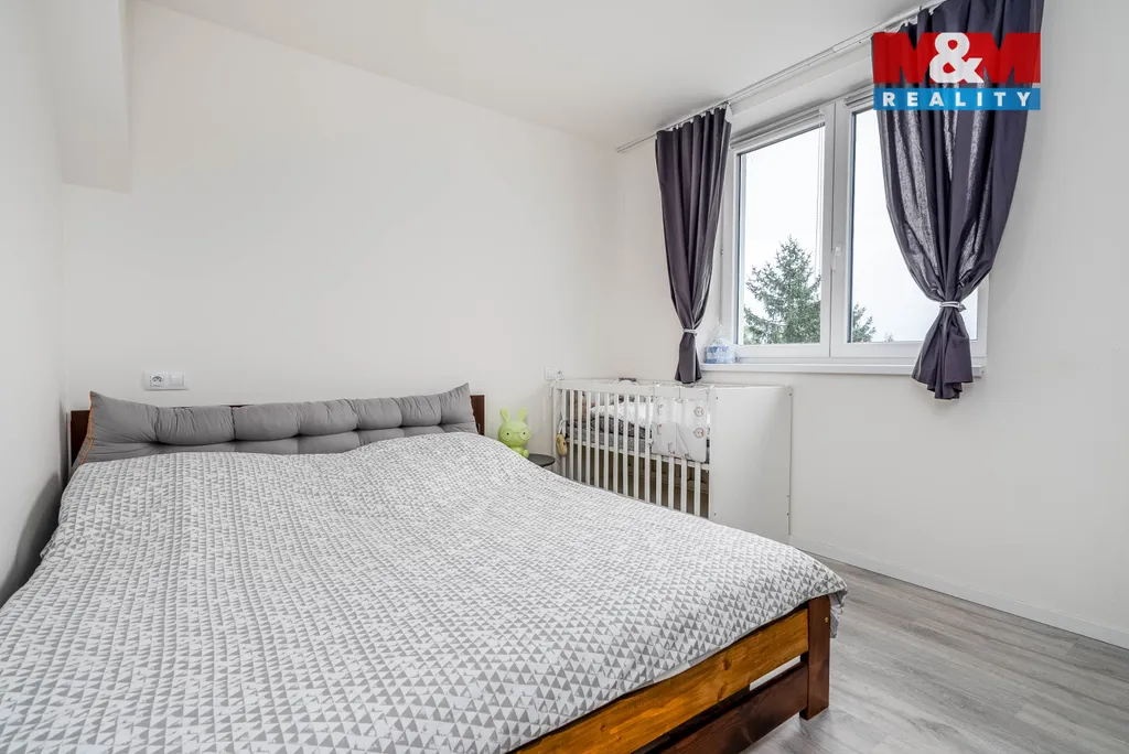 Po vstupu do bytu vás uvítá předsíň s vestavěnou skříní. Koupelna je prakticky oddělená od toalety. Na chodbu navazuje kuchyňský kout propojený s prostorným obývacím pokojem. Dále je zde oddělená ložnice a menší místnost, kterou lze využít jako pracovnu nebo relaxační koutek. K bytu patří sklep, kočárkárna a vlastní parkovací stání.