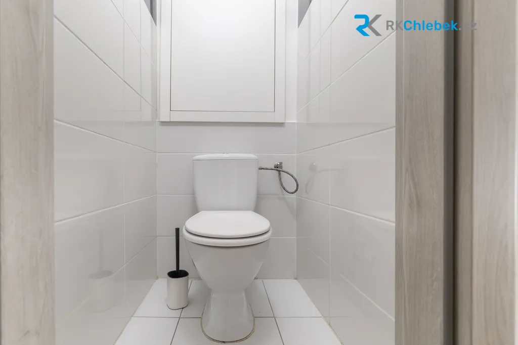 Součástí bytu je prostorná kuchyň, která nabízí dostatek místa pro jídelní stůl se židlemi. Koupelna je vybavena vanou, umyvadlem a prostorem pro pračku, přičemž toaleta je samostatná. Byt disponuje dvěma pokoji, z nichž jeden má vstup na lodžii, která je uzavíratelná pomocí skleněných panelů. K bytu náleží také sklepní kóje.