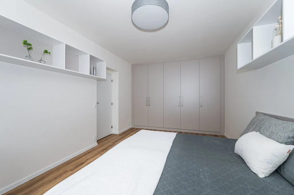 Součástí bytu je předsíň s velkou vestavnou skříní, komora s pračkou, koupelna vybavená záchodem a sprchovým koutem, hlavní obývací pokoj a ložnice. V obývacím pokoji je plně vybavená kuchyňská linka s ostrůvkem (spotřebiče - lednice, myčka, mikrovlnná trouba, digestoř, indukční varná deska, pečící trouba) a dále je v pokoji k dispozici dostatek promyšlených úložných prostor, TV a samozřejmostí je také vybavenost veškerým nábytkem: jídelní stůl, židle, psací stoly vč. kancelářských židlí a postele s komfortními matracemi. Dále je zde k dispozici druhá samostatná ložnice s dalšími úložnými prostory a vybavená nábytkem: psací stoly vč. kancelářských židlí a postele s komfortními matracemi. Vše poskytnuto pronajímatelem. Výhled je orientovaný do vnitrobloku, který je tvořen okrasnou zahradou.