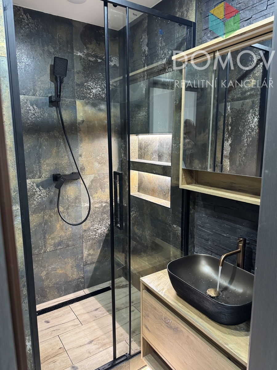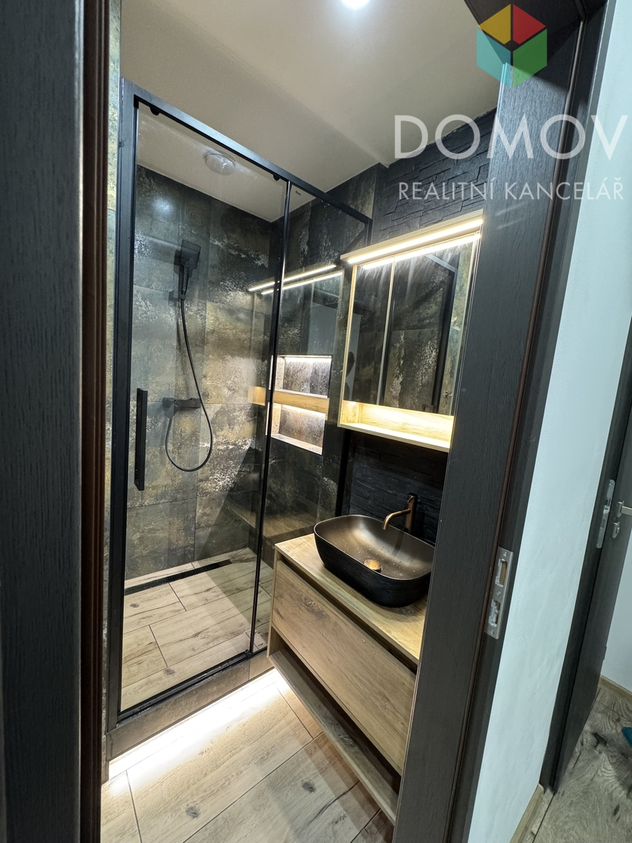 Součástí bytu je koupelna se sprchovým koutem a přípojkou na pračku i sušičku, samostatná toaleta a kuchyň s kuchyňskou linkou a přípojkou na myčku (bez lednice).