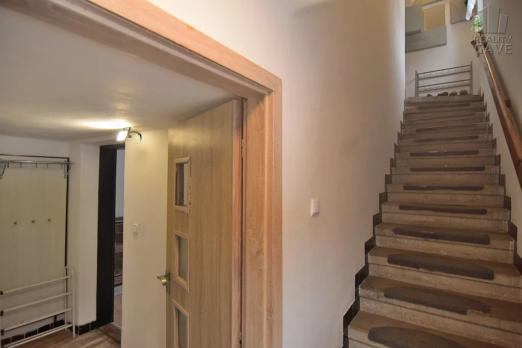 V patře je 3+kk a velká koupelna. Podlaží jsou spojena betonovým schodištěm.