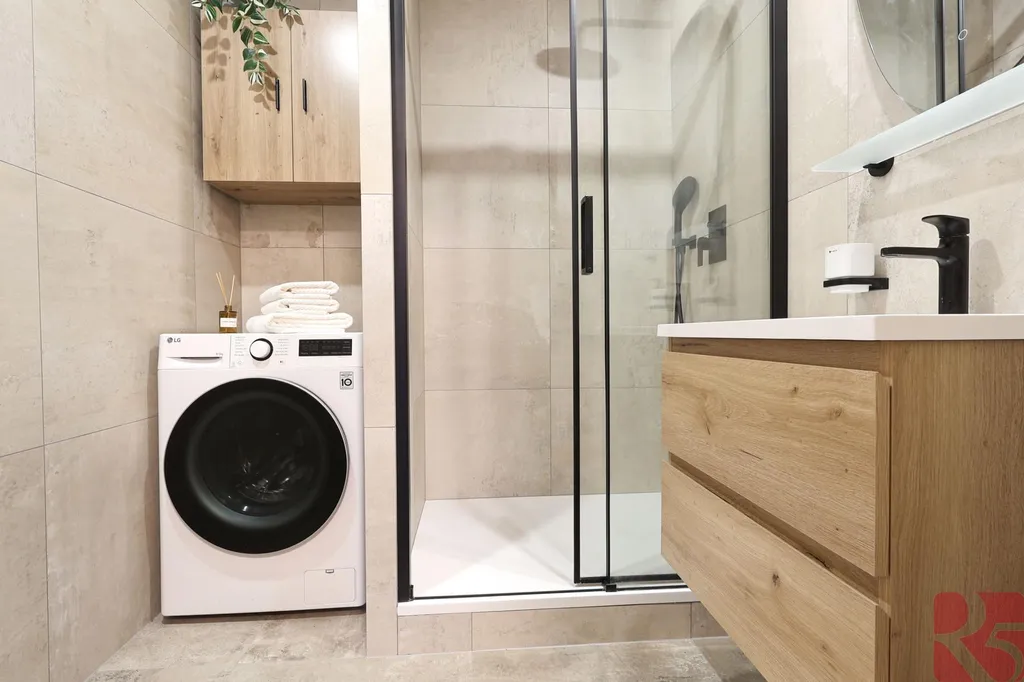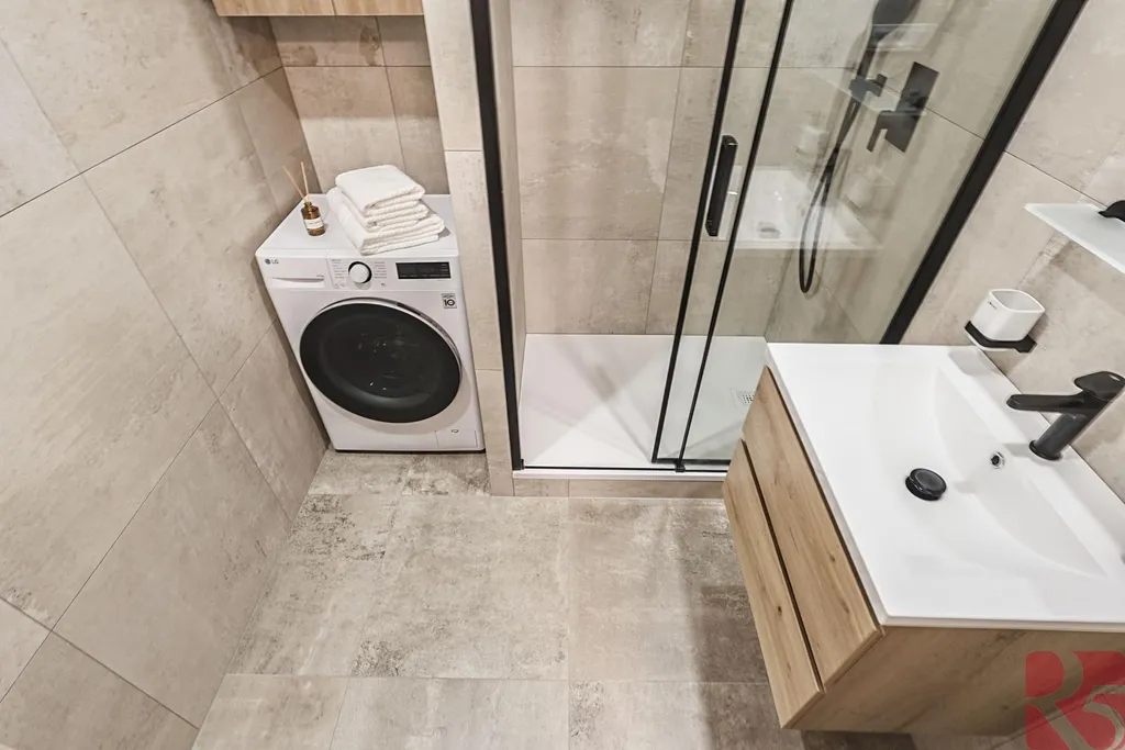 Koupelna se sprchovým koutem a odděleným místem na pračku a případně i sušičku, dva samostatné elektrické okruhy.