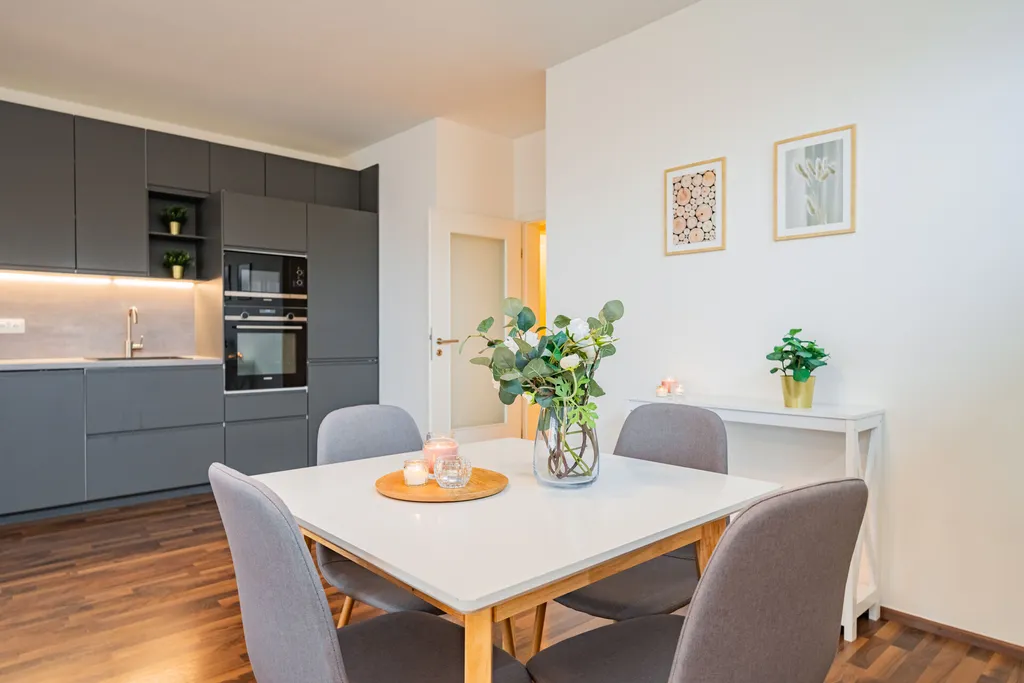 Byt je navržen tak, aby bylo možné jeho praktické a funkční zařízení. Vstupní dveře bytu jsou certifikovány 3. třídou bezpečnosti a je zde příprava pro instalaci elektronického bezpečnostního systému. Podlahová krytina je v pokojích plovoucí podlaha a v chodbě a koupelnách je instalována dlažba. K bytu náleží parkovací místo v přízemí budovy a sklep o rozloze téměř 3 m2, oboje je již zahrnuto v prodejní ceně.