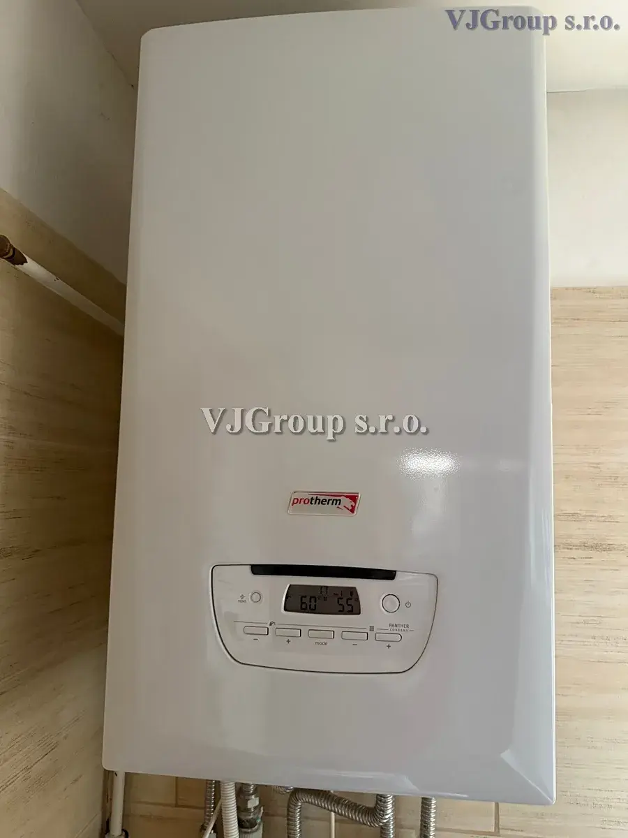 Vytápění domu je zajištěno ústředním topením s měděnými rozvody do radiátorů napojených na kondenzační plynový kotel zn. Protherm umístěný v koupelně v přízemí domu, který zajišťuje zároveň ohřev TUV.