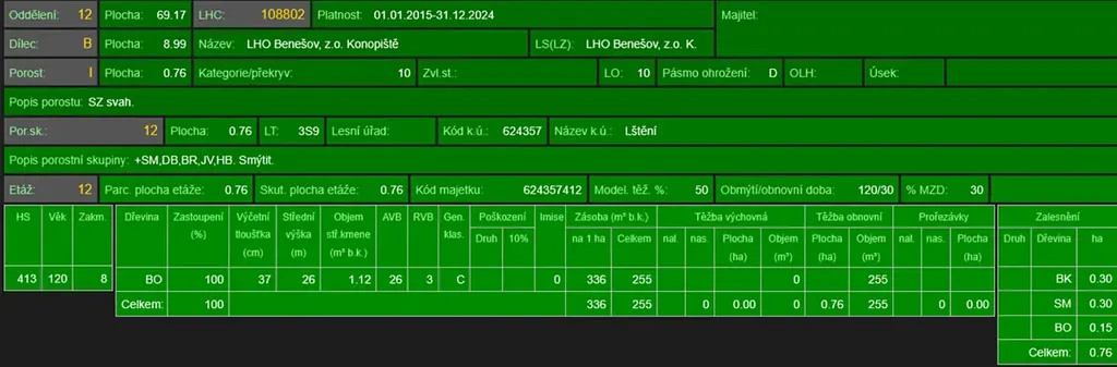- p.č. 437/16 vedená jako lesní pozemek o celkové výměře 7 603 m2 (stáří lesa 131 let - zastoupení dřevin borovice).