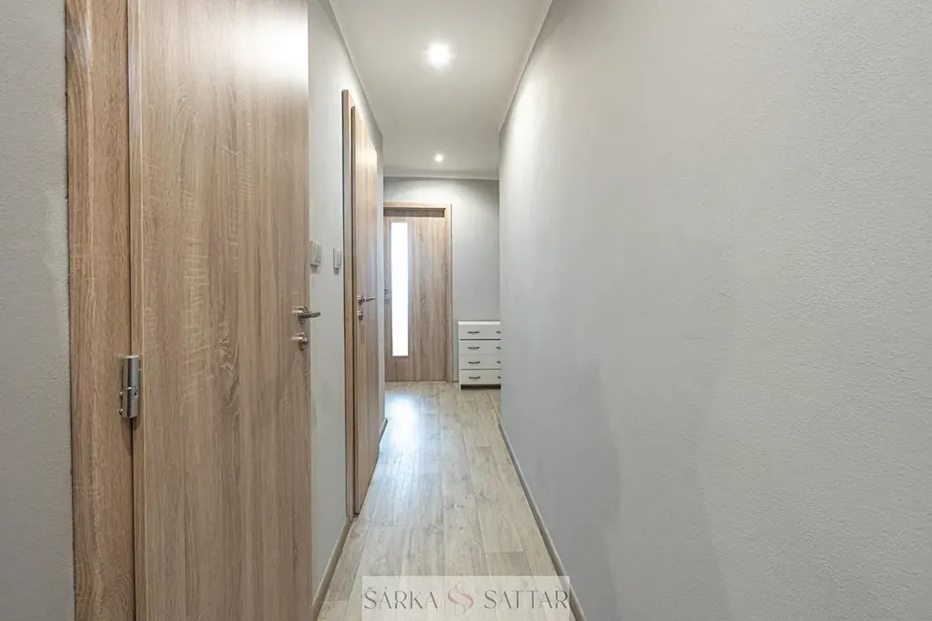 Prostorný obývací pokoj (19.5m2) se vstupem na prostornou lodžii s posuvným zasklením, samostatnou kuchyň (11m2) vybavenu el. troubou, plynovou varnou deskou, myčkou, lednicí s mrazákem. Obě ložnice mají východní orientaci. Koupelna má vanu dále umyvadlo, přívod na pračku. Toaleta je samostatná. V bytě je vestavěná skříň u vstupu a také vestavěný úložný prostor.