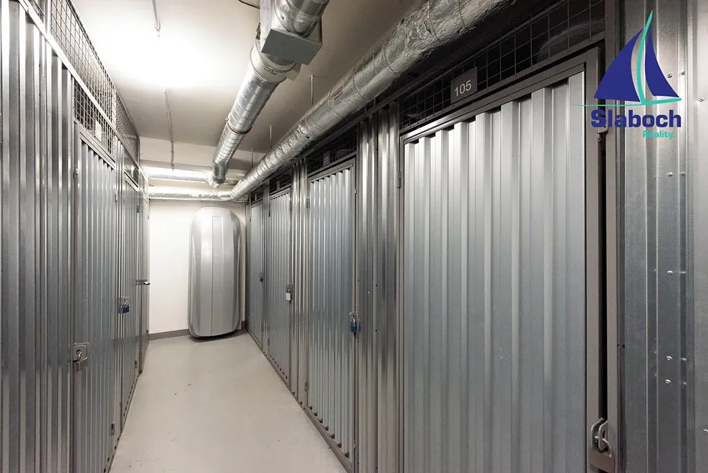 K bytu naleží a je součástí prodejní ceny široké a prostorné krajní parkovací stání a sklepní koje (3m2) v 1 podzemním podlaží domu.