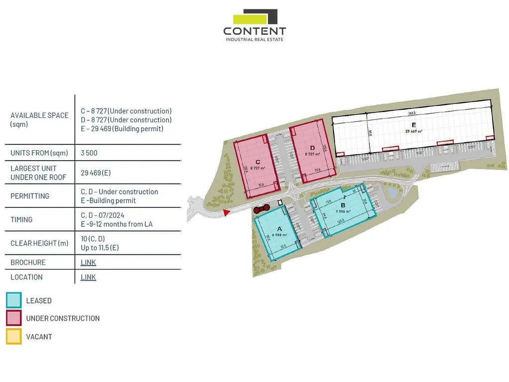 - v areálu k dispozici prostory od 3500 m² do 29469 m² pod jednou střechou