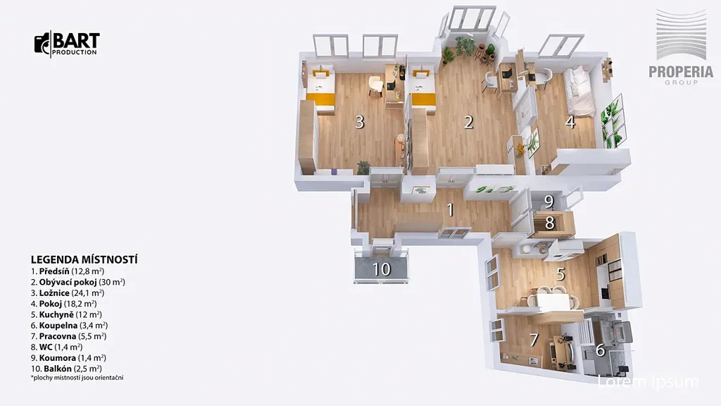 Dispozičně byt zahrnuje tři prostorné pokoje, kuchyň, koupelnu, samostatné WC a menší pokoj původně určený pro služku, který lze prakticky využít například jako pracovnu, šatnu nebo komoru. Byt je orientován na sever i jih, díky čemuž je velmi dobře prosvětlený po celý den. Součástí bytu je také menší balkon orientovaný do klidného vnitrobloku.