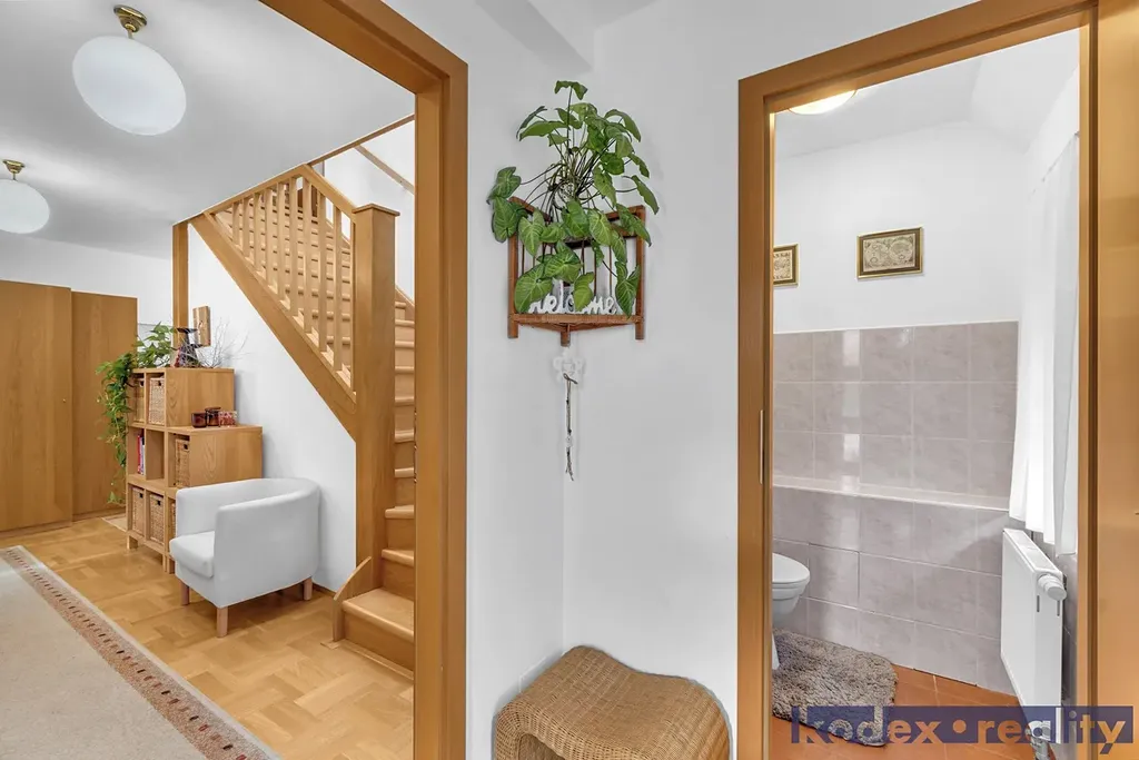 Přízemí - zádveří, WC, hala s botníkem a schodištěm do 1.patra, obývací pokoj s jídelnou a kuchyňským kouterm, ložnice, komora, koupelna s vanou i sprchovým koutem, WC a bidetem, spojovací úložná místnost do garáže pro dva automobily, jejíž součástí je také technická místnost a dílna se vstupem na zahradu.