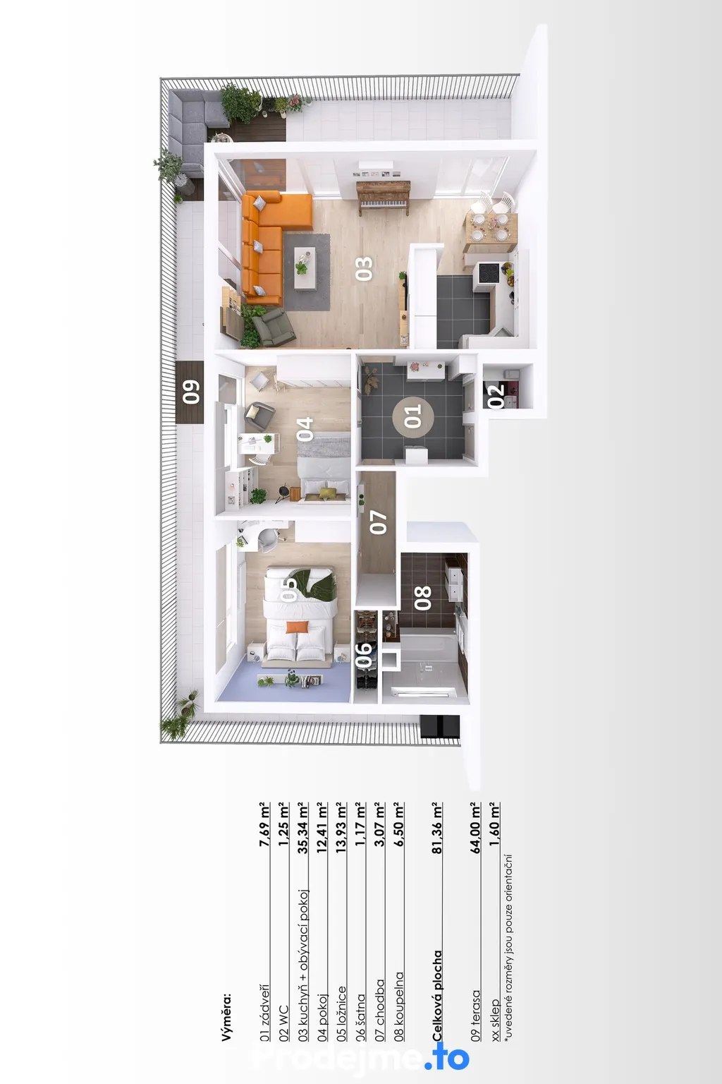 Dominantou bytu je terasa o ploše 66 m², přístupná z obývacího pokoje i dětského pokoje. Nabízí dostatek místa pro posezení, jídelní kout pod širým nebem i relaxační zónu s venkovní sprchou, ideální pro letní osvěžení. Samozřejmostí je také působivý výhled, který dodává tomuto bydlení další rozměr.