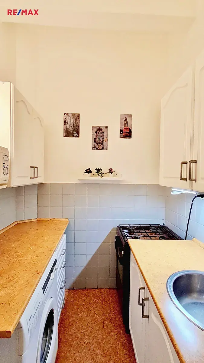 Ve vstupní chodbě bytu se nachází vestavěná skříň s dostatkem úložných prostor. Menší kuchyňka disponuje plynovým sporákem s troubou, mikrovlnnou troubou, k dispozici je také lednice.