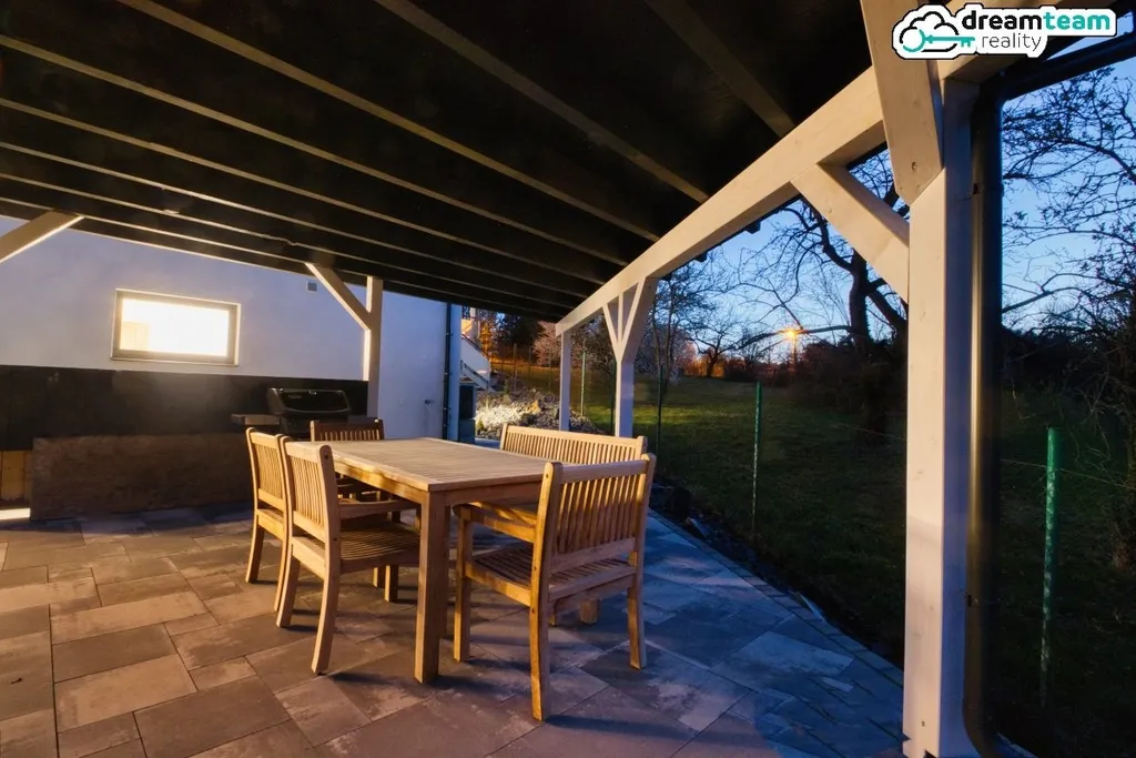 Prostorná pergola za domem s výhledem na Radhošť je jako stvořená pro nedělní brunche, letní grilovačky nebo večerní posezení s přáteli. Radegast shlíží z dálky a tiše schvaluje vaše kulinářské počiny. A když večer rozsvítíte světýlka na pergole, vytvoříte atmosféru, která by se dala krájet a mazat na chleba.