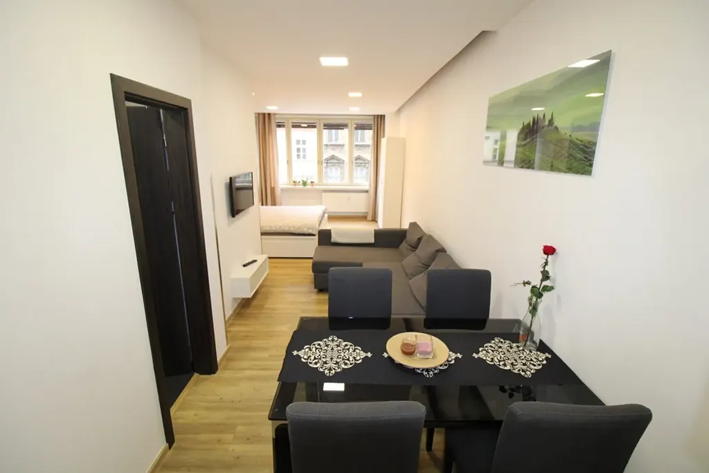 Nabízíme pronájem zařízeného bytu 1+kk ve 2. patře cihlového domu na Praze 1, Nové Město, ulice Opletalova, kousek od metra A,C - Muzeum.