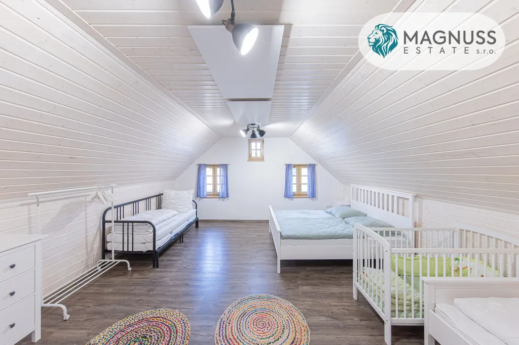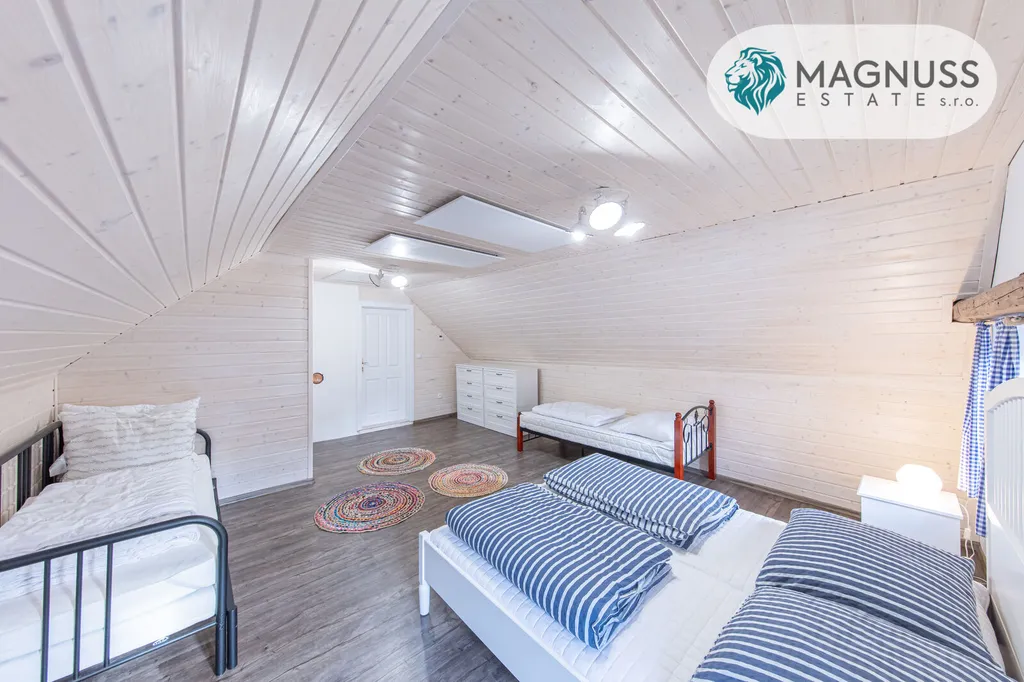 Pro investiční využití nabízí nemovitost ubytovací kapacitu až 18 hostů. K dispozici je venkovní bazén s tepelným čerpadlem, krytá venkovní vířivka, dětské hřiště, venkovní posezení na zahradě i terase. V interiéru pak prostorná společenská místnost a herna.