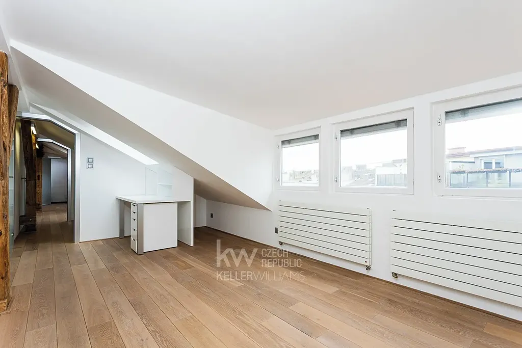 Dominantou bytu je terasa o velikosti 23 m², orientovaná do tichého vnitrobloku – ideální místo pro relaxaci. Menší terasa (cca 8 m²) se nachází o patro výš a nabízí výjimečný panoramatický výhled na Pražský hrad.