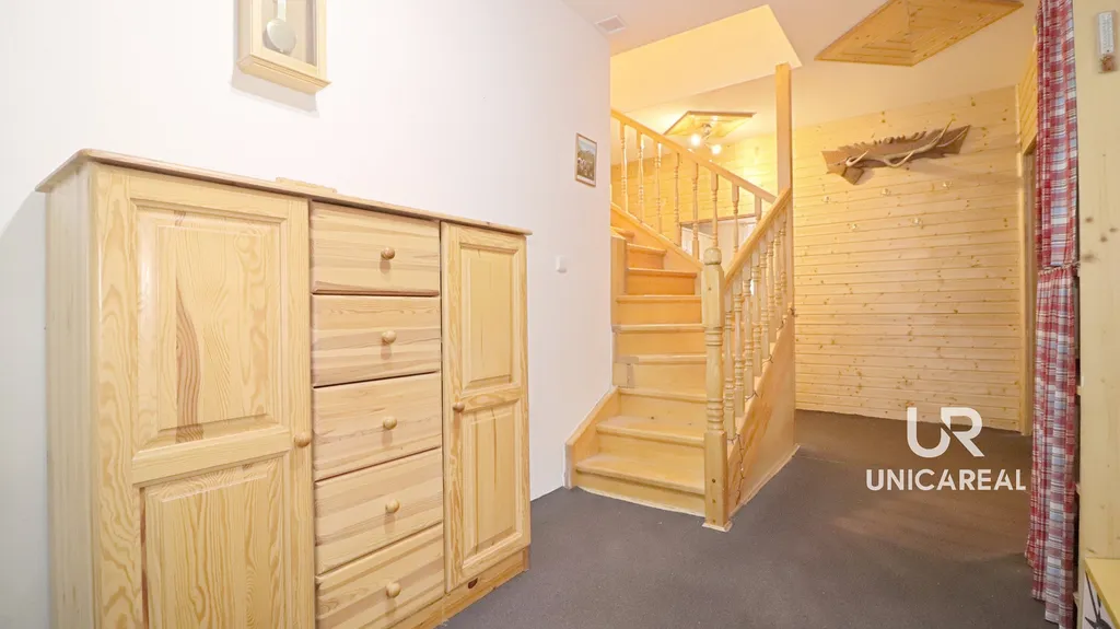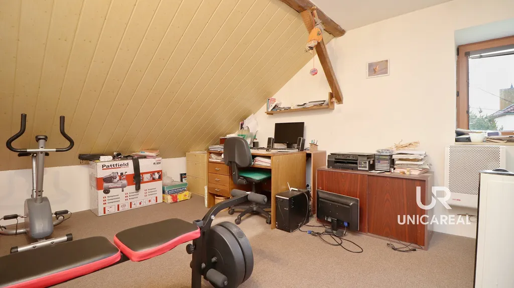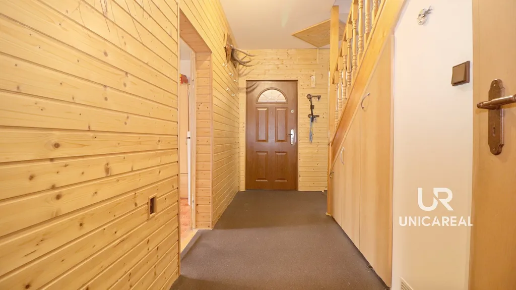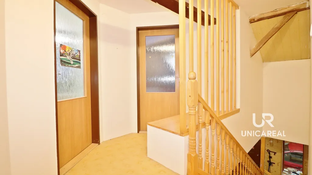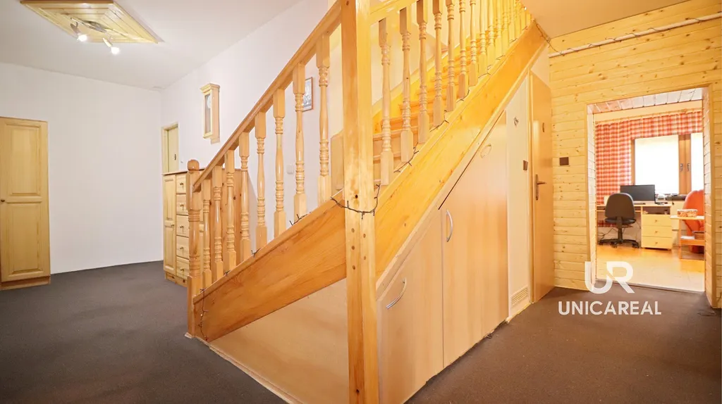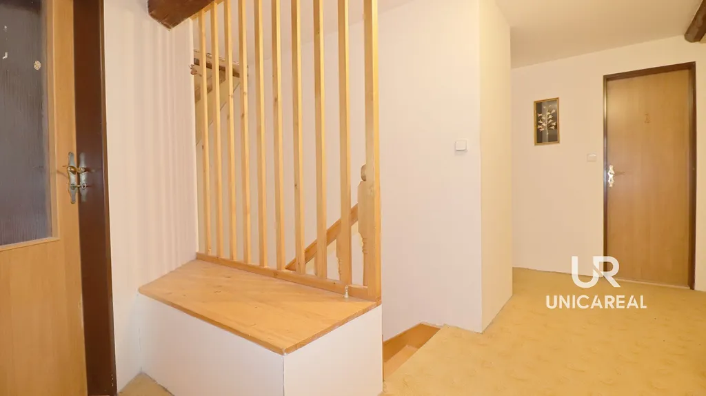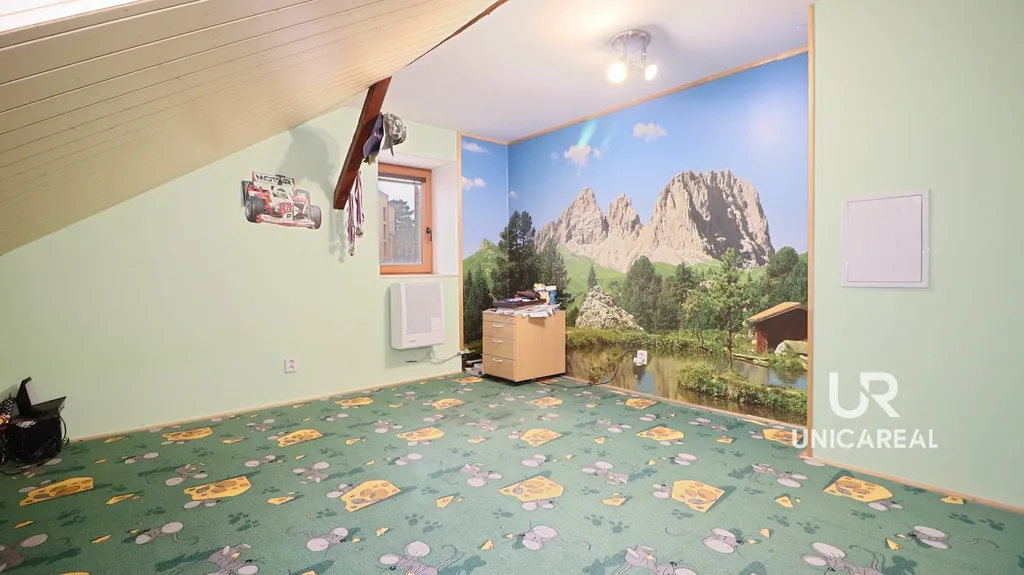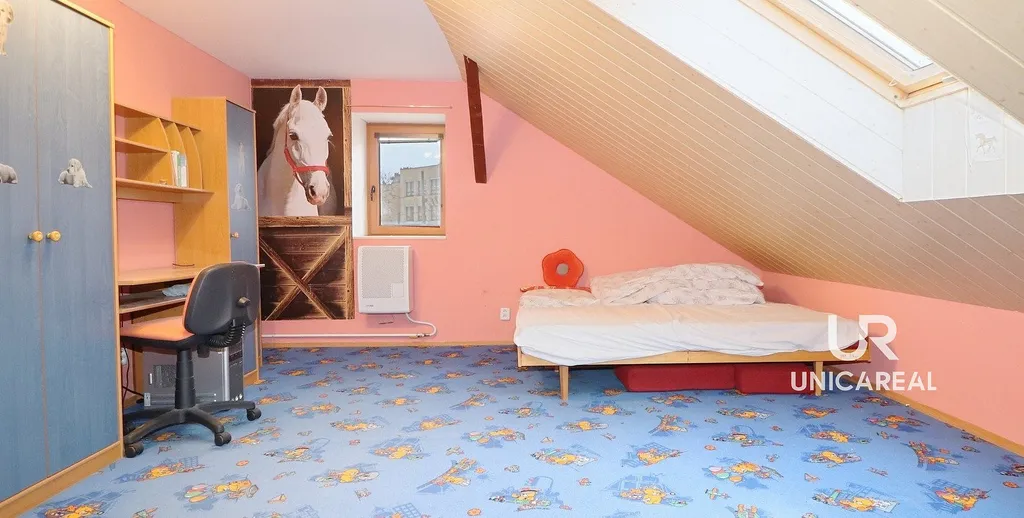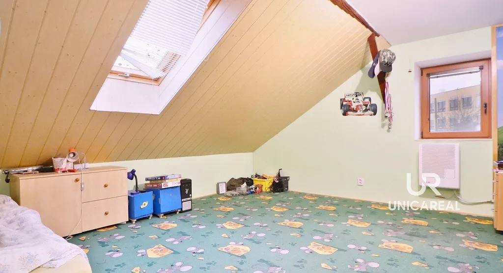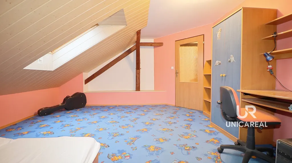 Po masivním dřevěném schodišti se dostanete do podkroví, kde se nachází předsíň, pracovna se vstupem na půdu (využívanou jako úložný prostor), dva dětské pokoje, toaleta a komora. Okna jsou plastová, v podkroví střešní okna zn. Velux.