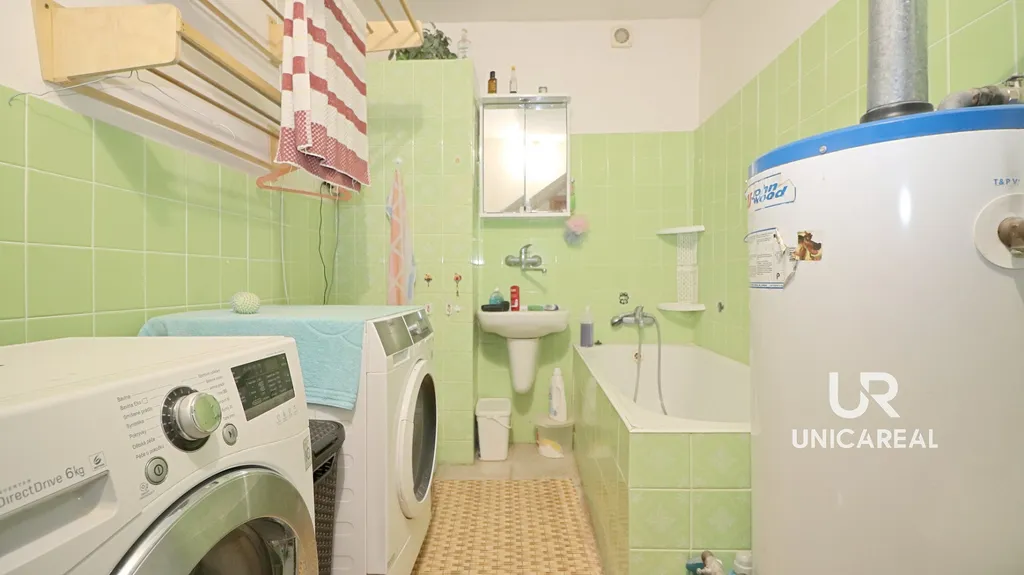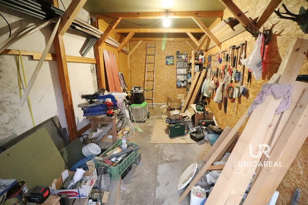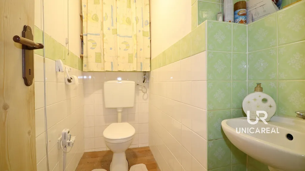 Dispozice domu je následující: v přízemí se nachází veranda, prostorná hala, koupelna s vanou, umyvadlem, bidetem a bojlerem, samostatné WC, ložnice, obývací pokoj s krbovými kamny a kuchyně s jídelním koutem. Kuchyň je vybavena spotřebiči – sklokeramická deska, horkovzdušná trouba, digestoř, myčka a lednice s mrazákem. Z obývacího pokoje je přístup do komory a dále do dvora.